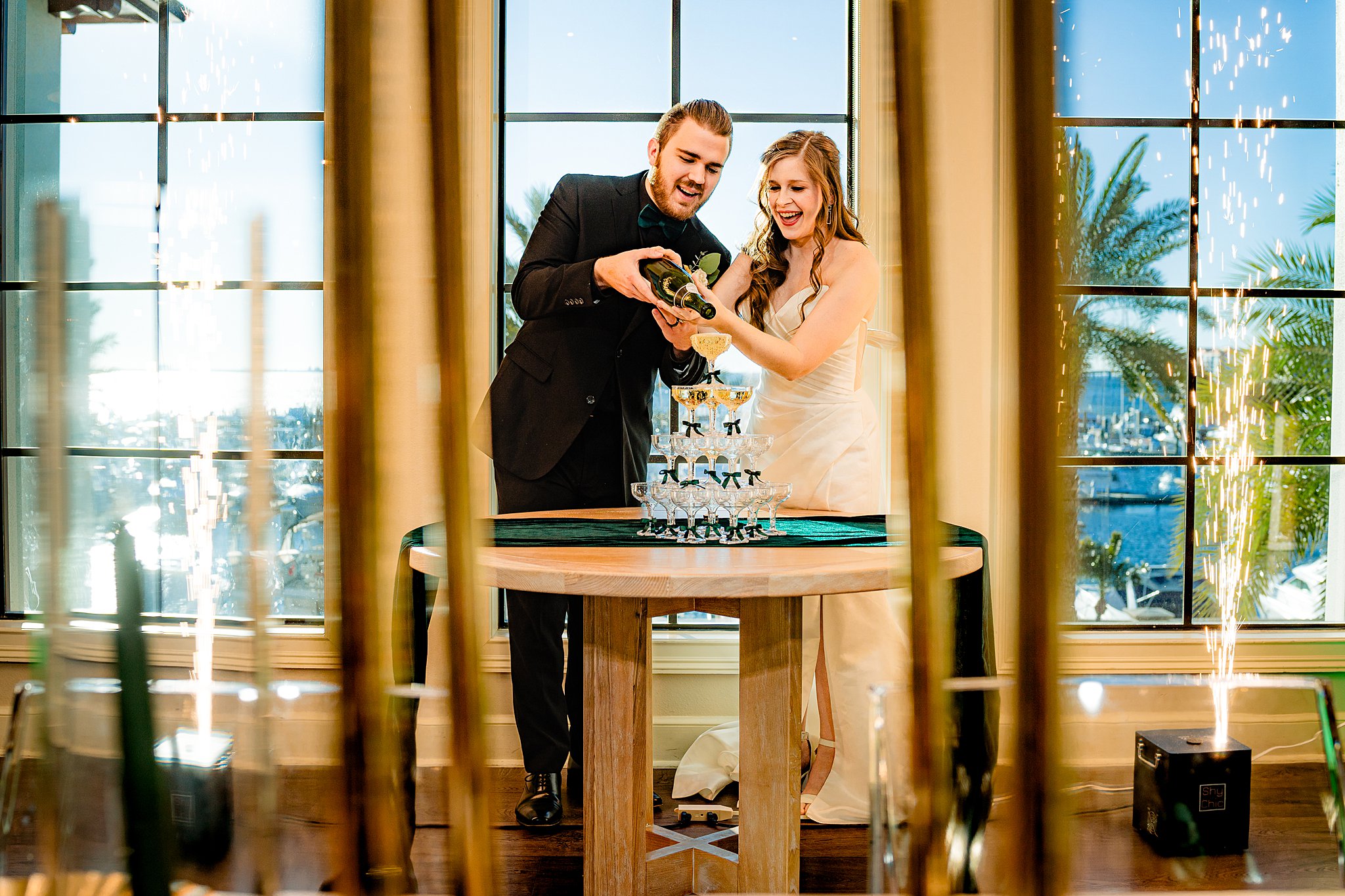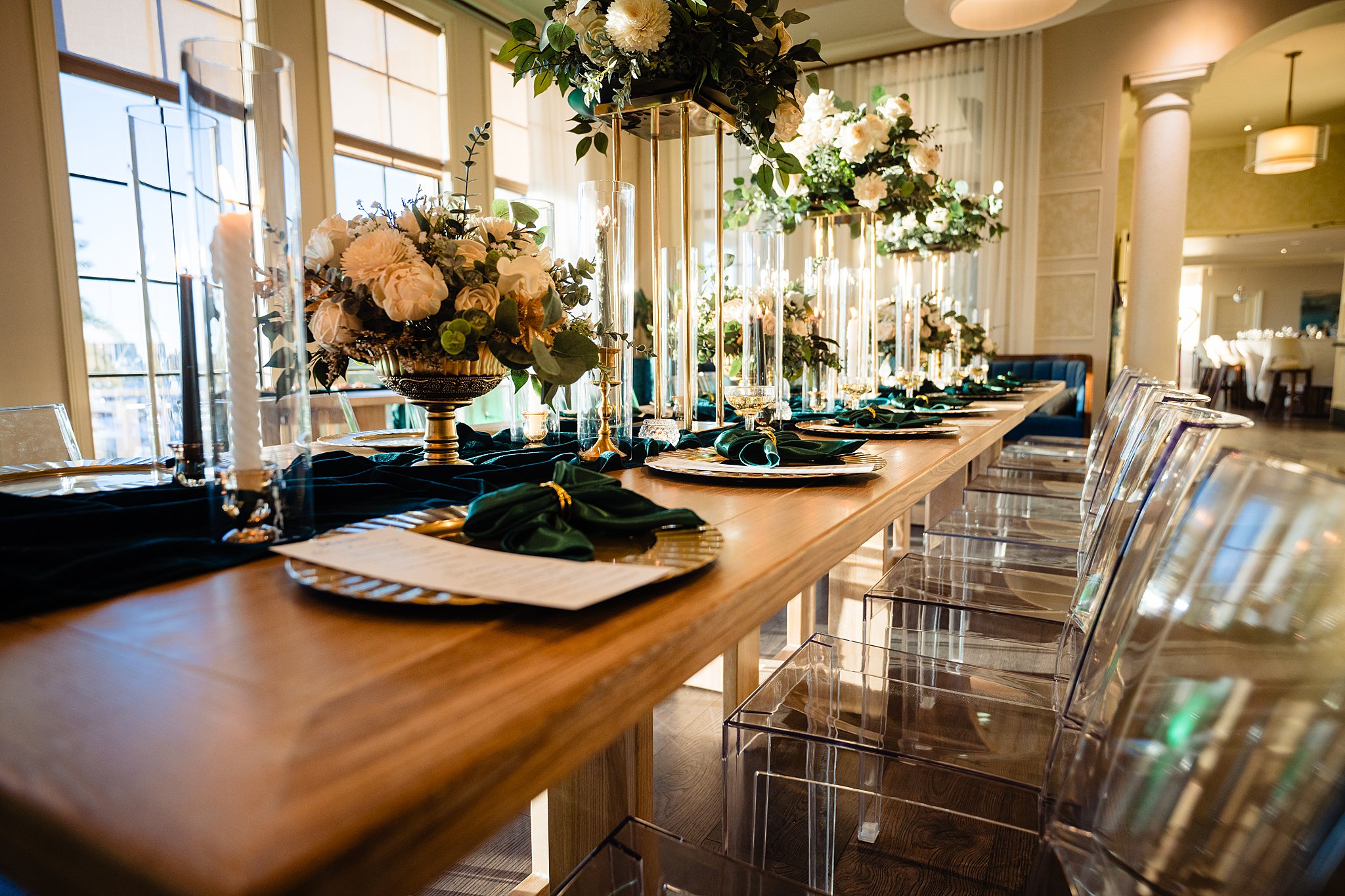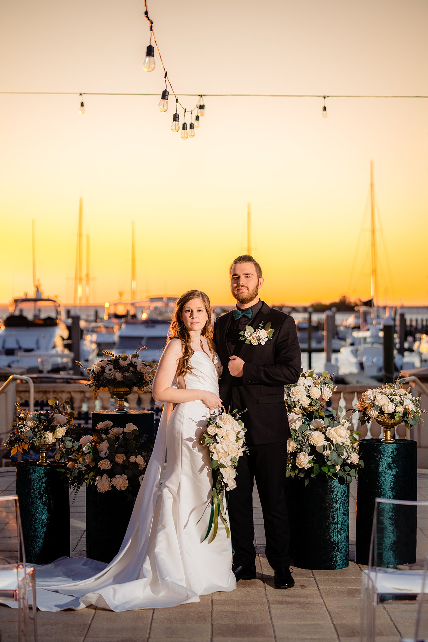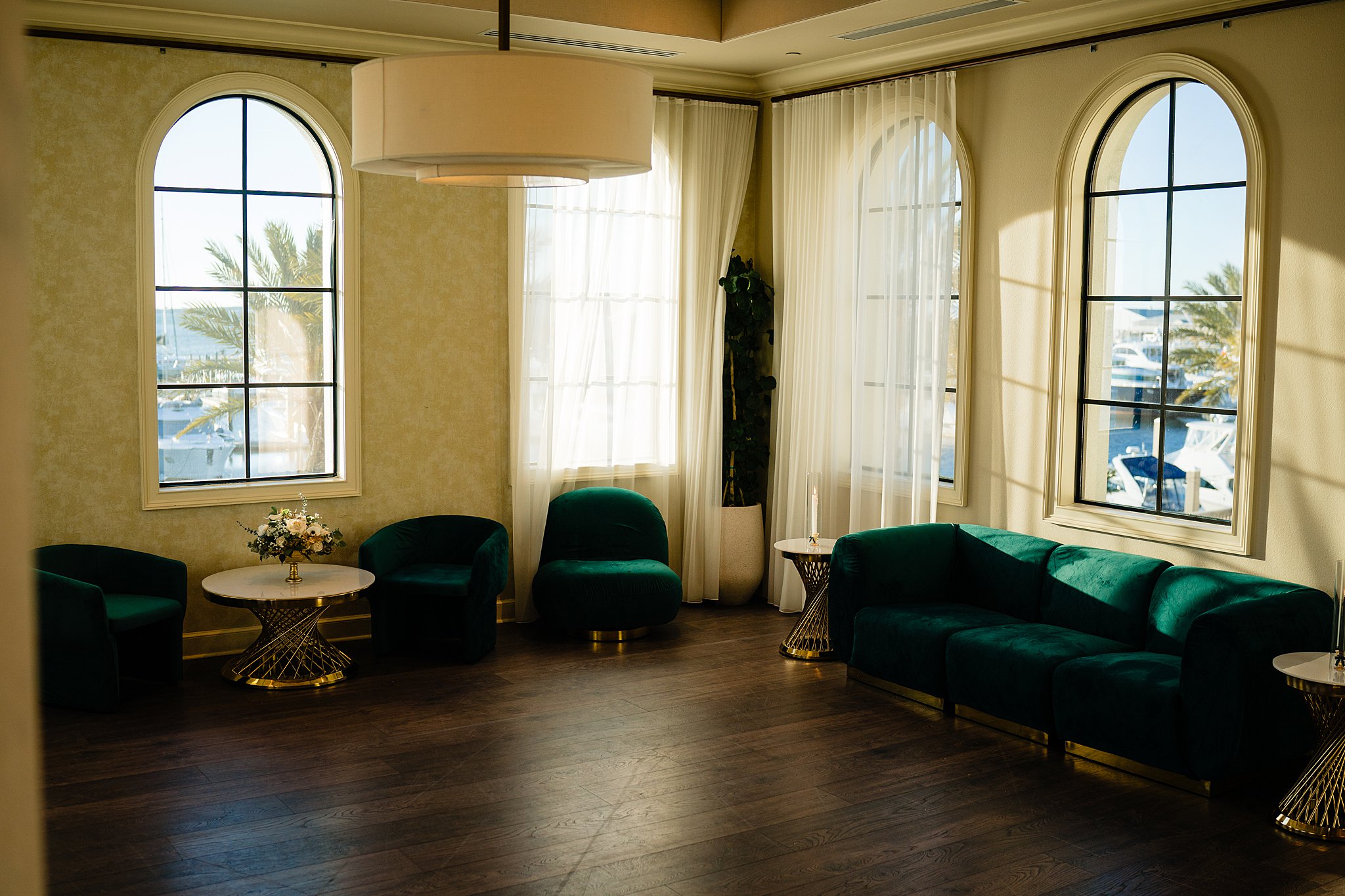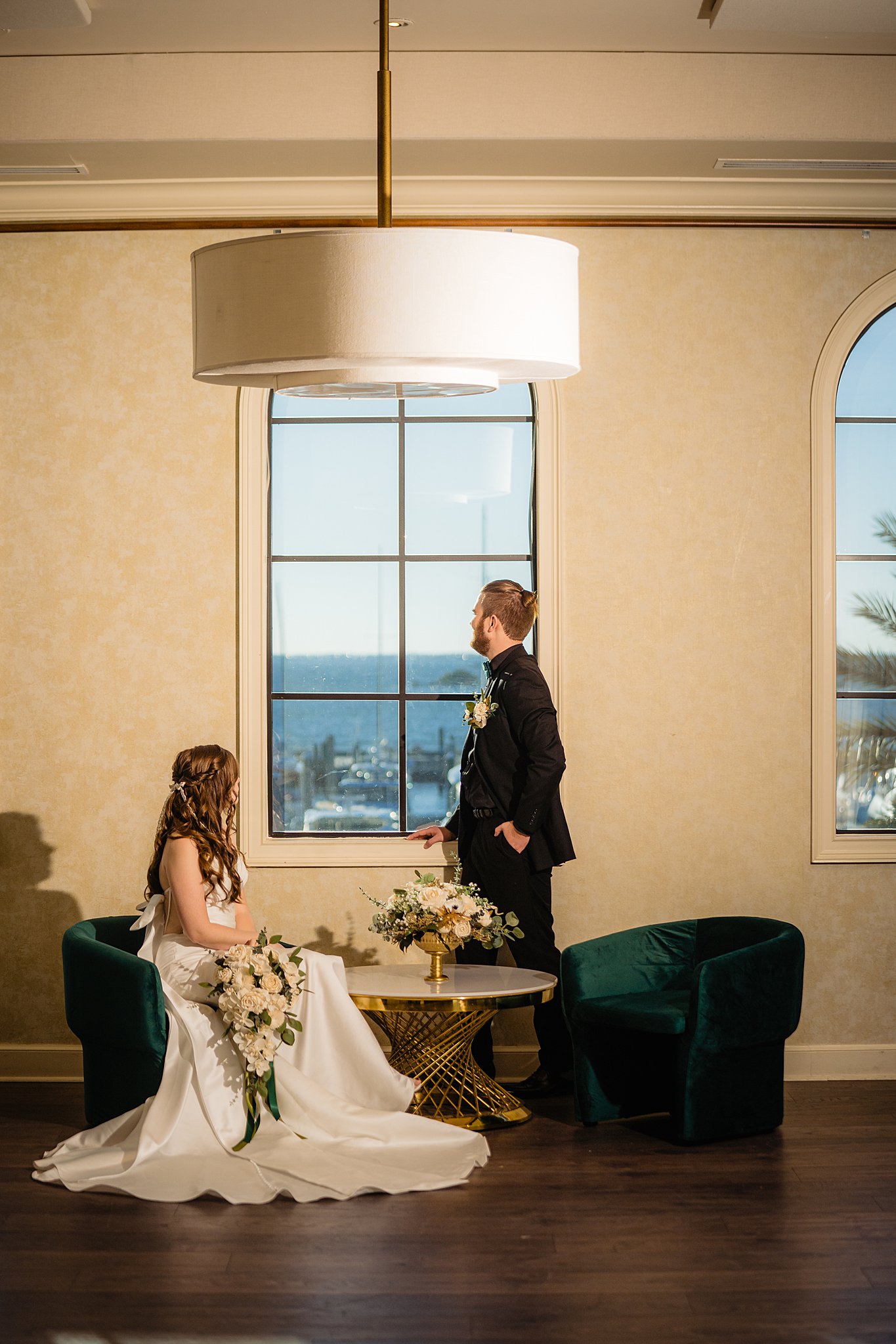The collaboration between talented vendors brought the vision to life, blending classic and contemporary styles. From Shy Chic Boutique’s statement florals to the stunning gown by Bearer of the Bling Bridal and décor from Stella Rose Events, every detail shined. The mix of emerald, ivory, and ash wood created an unforgettable setting framed by the marina views and the relaxed comfort that made this shoot truly special.