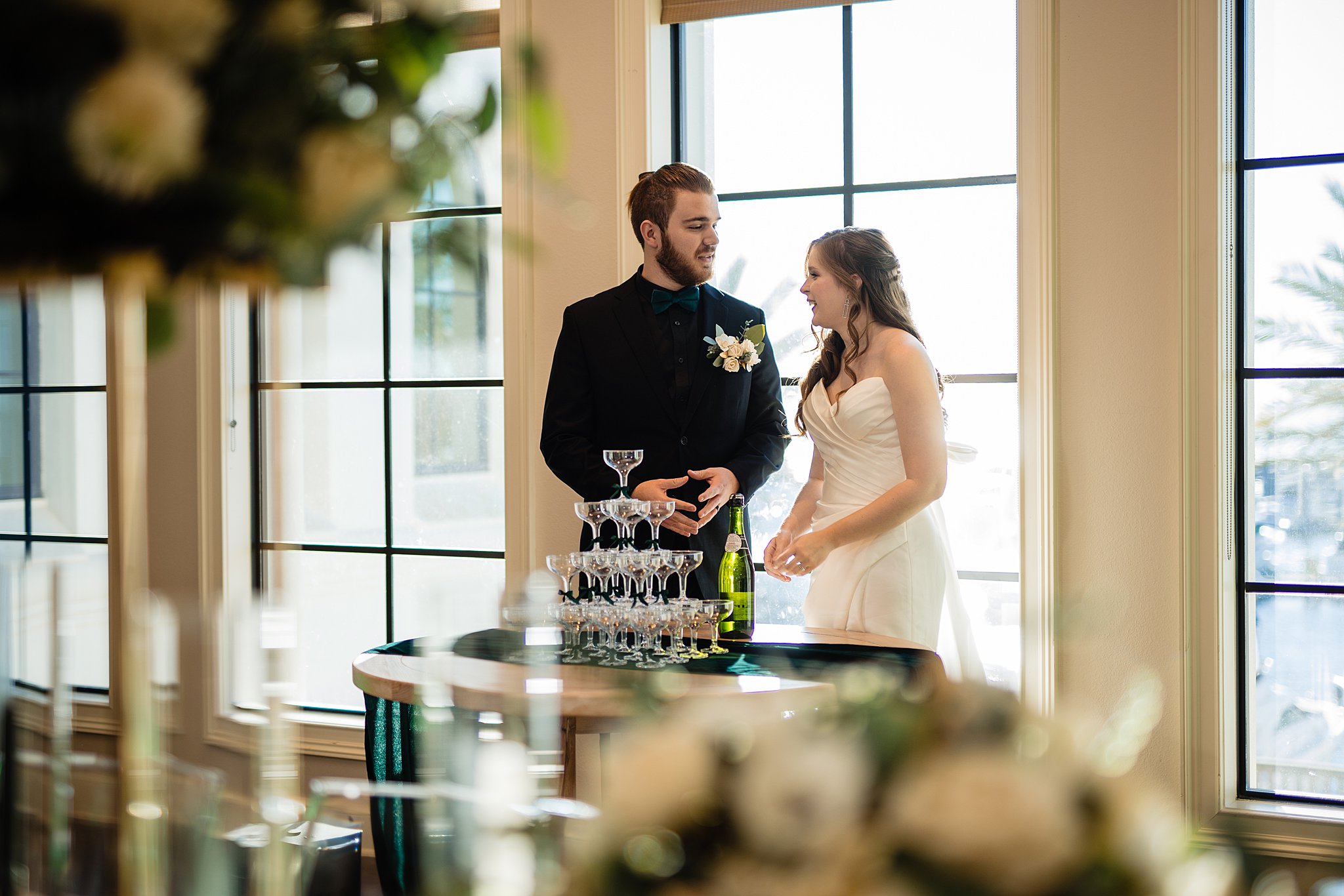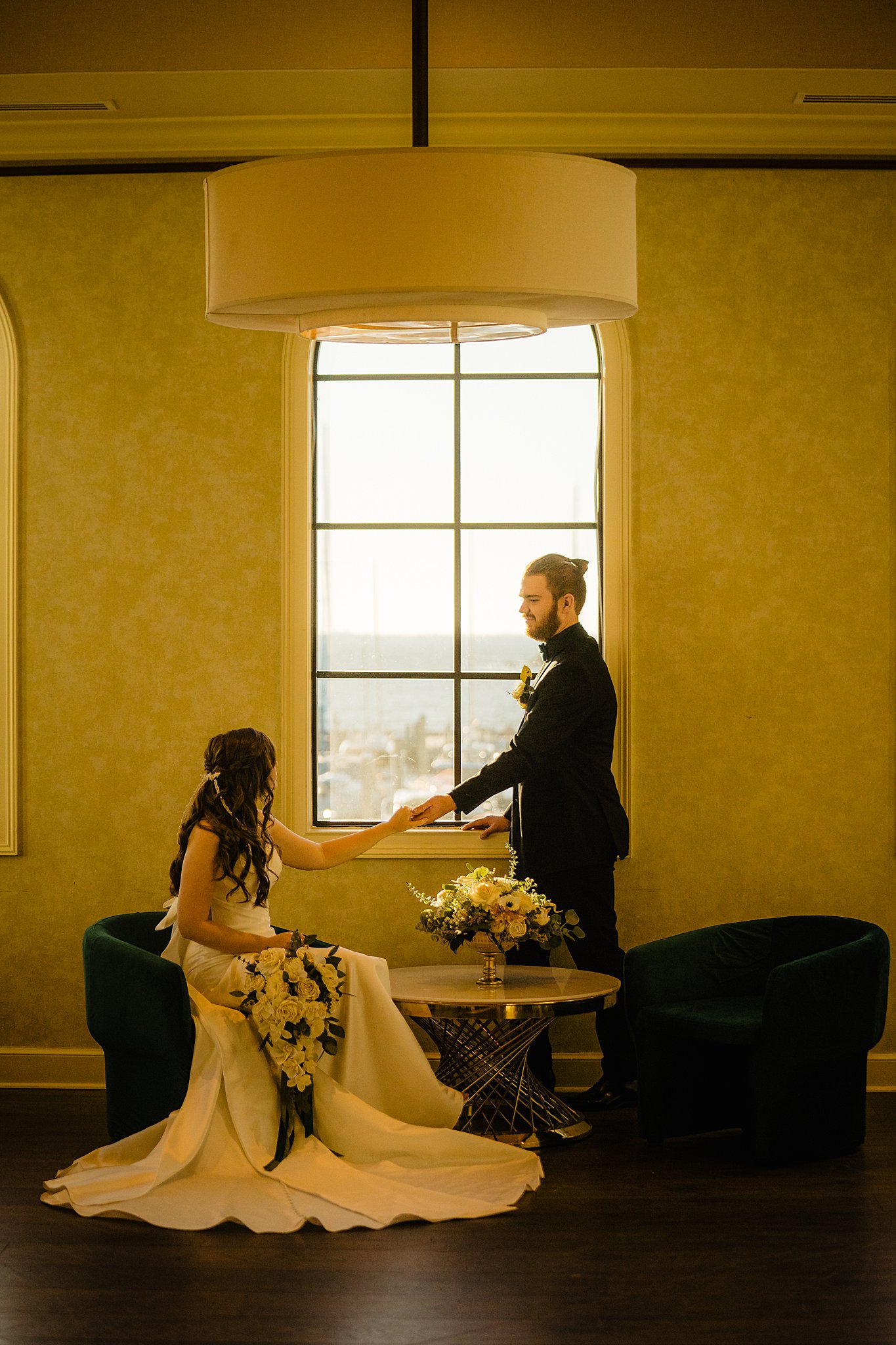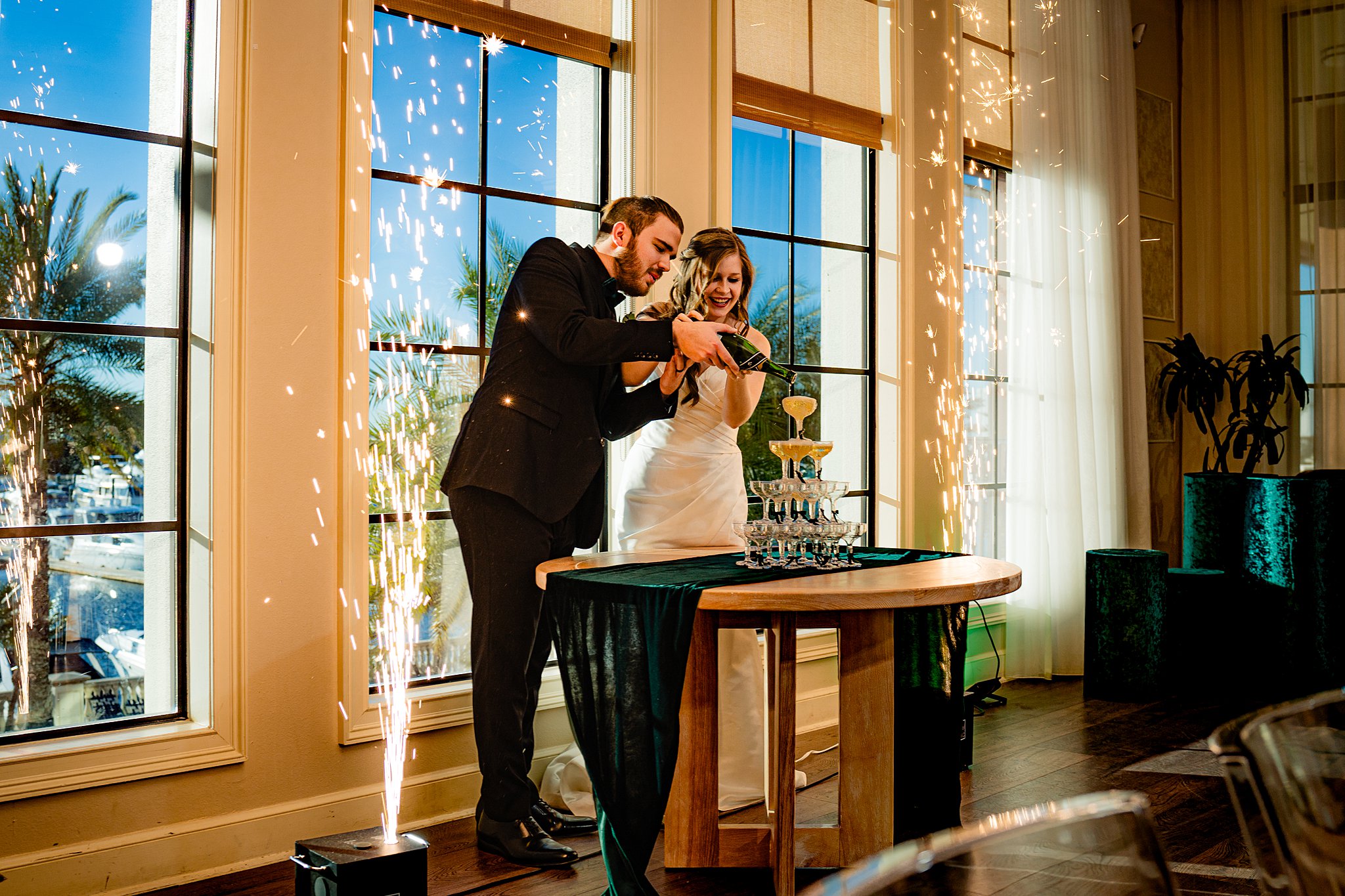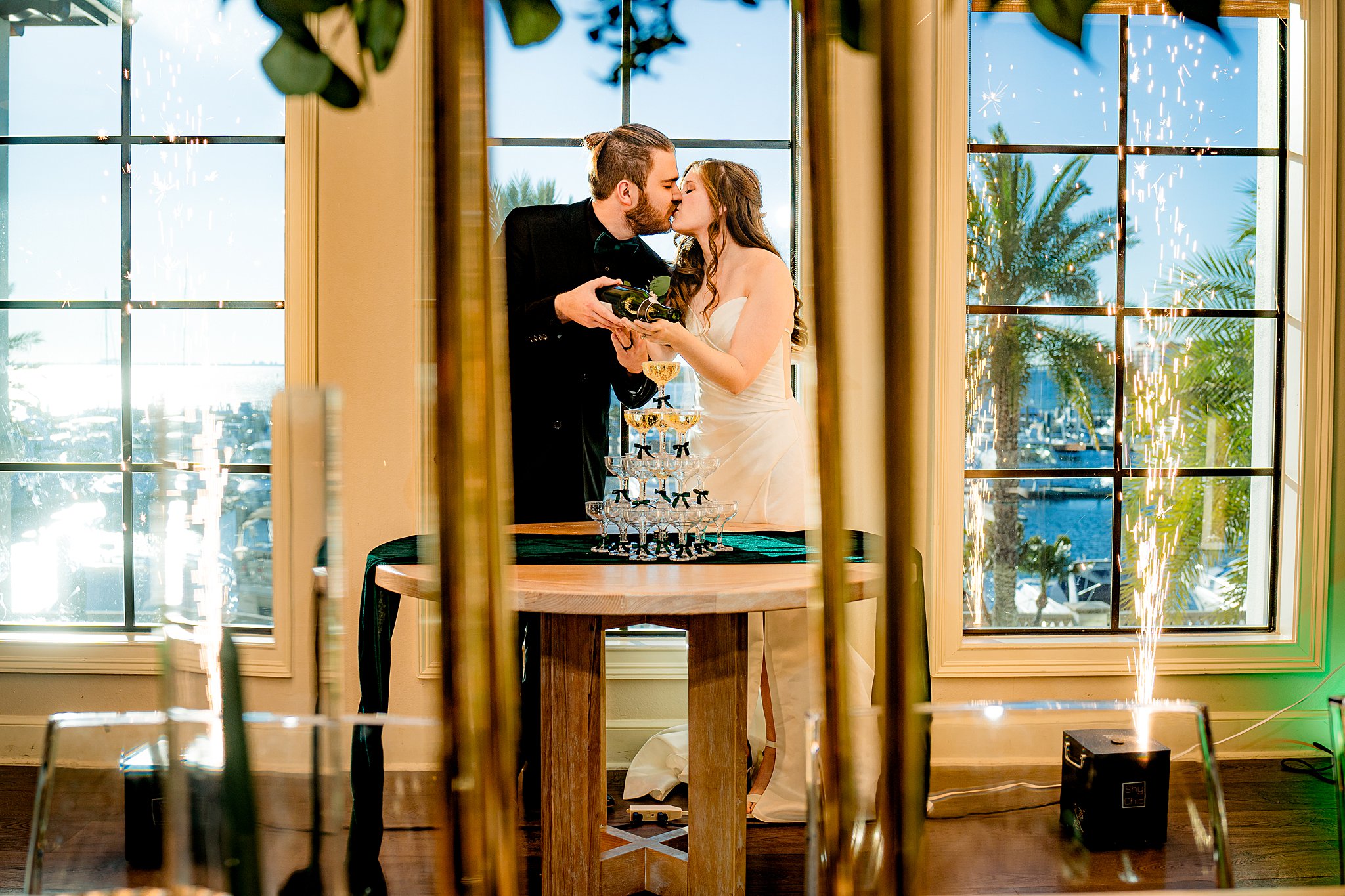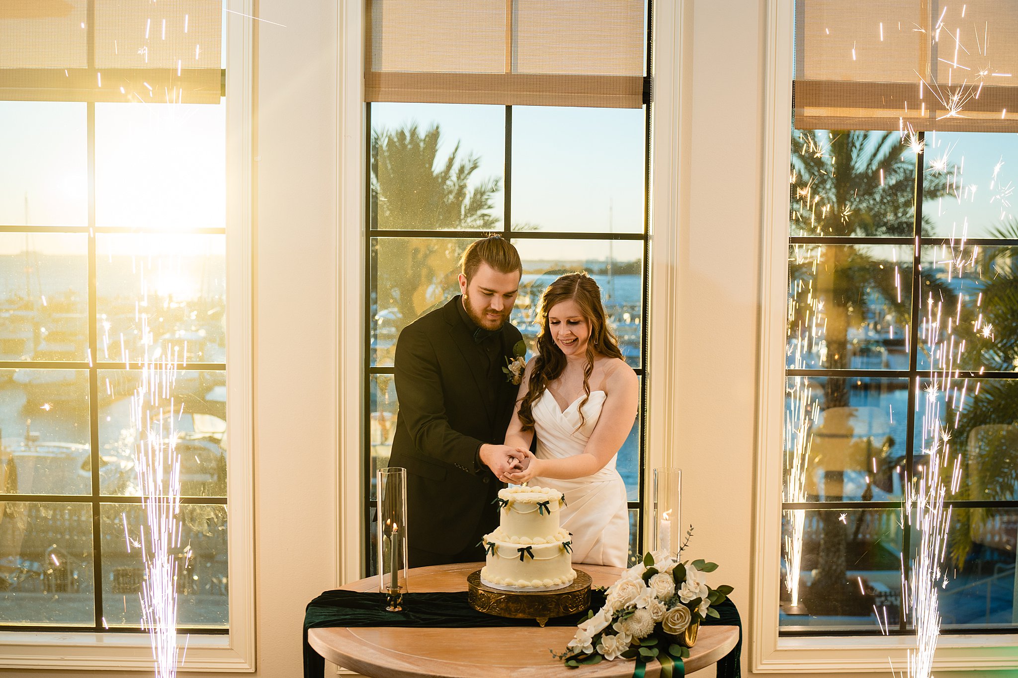 The collaboration between talented vendors brought the vision to life, blending classic and contemporary styles. From Shy Chic Boutique’s statement florals to the stunning gown by Bearer of the Bling Bridal and décor from Stella Rose Events, every detail shined. The mix of emerald, ivory, and ash wood created an unforgettable setting framed by the marina views and the relaxed comfort that made this shoot truly special.
