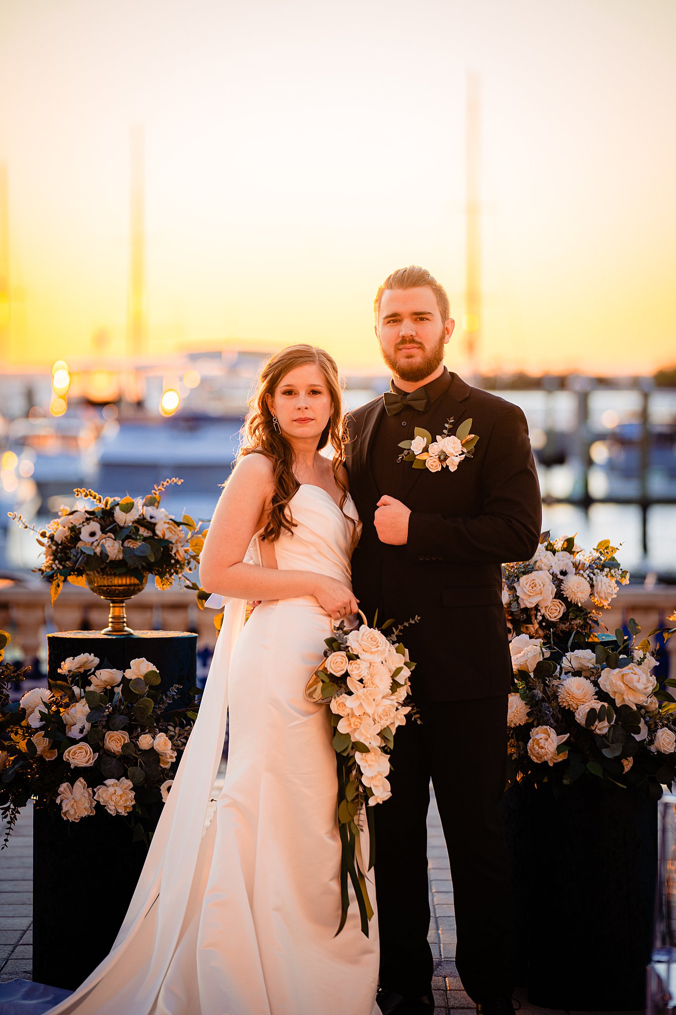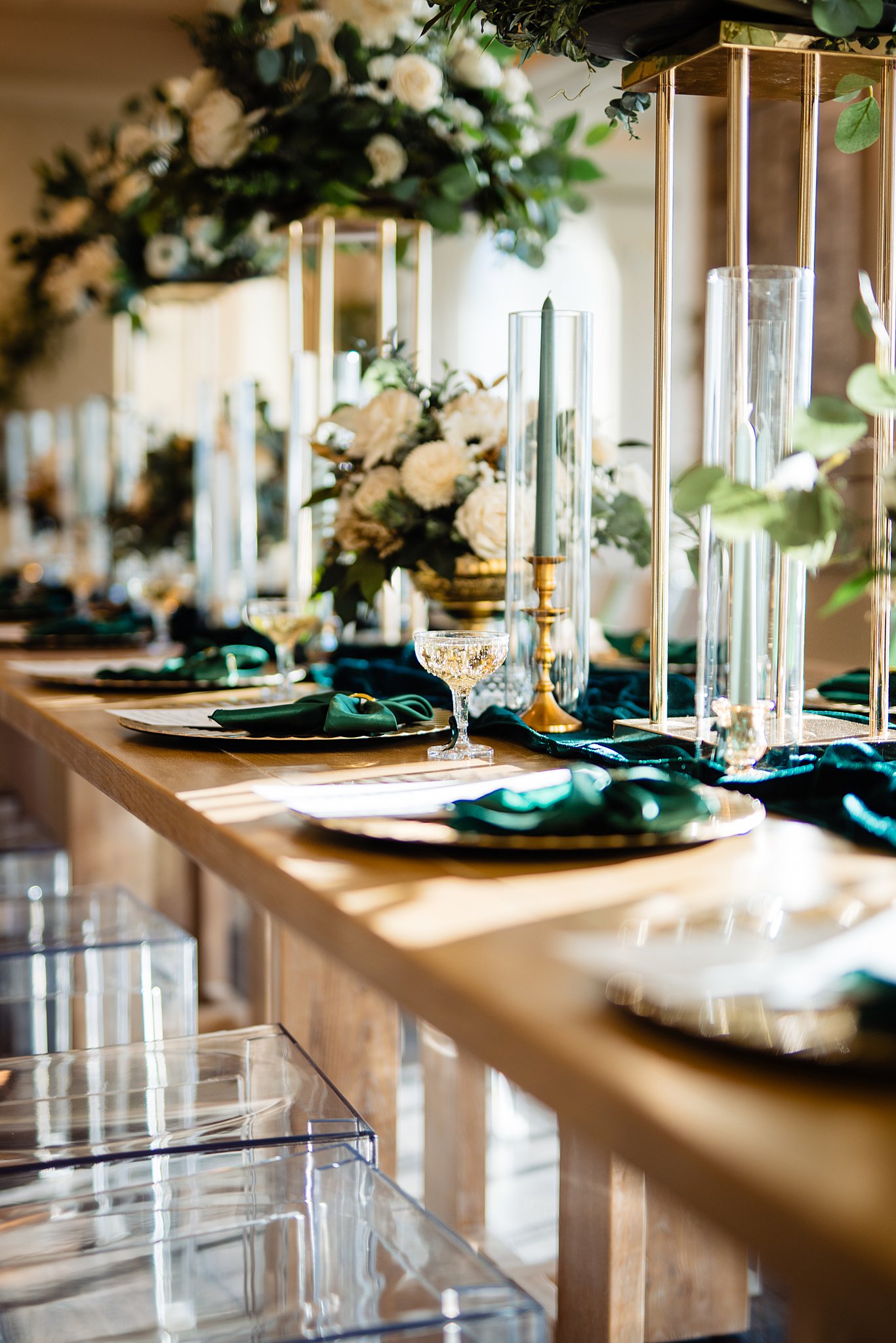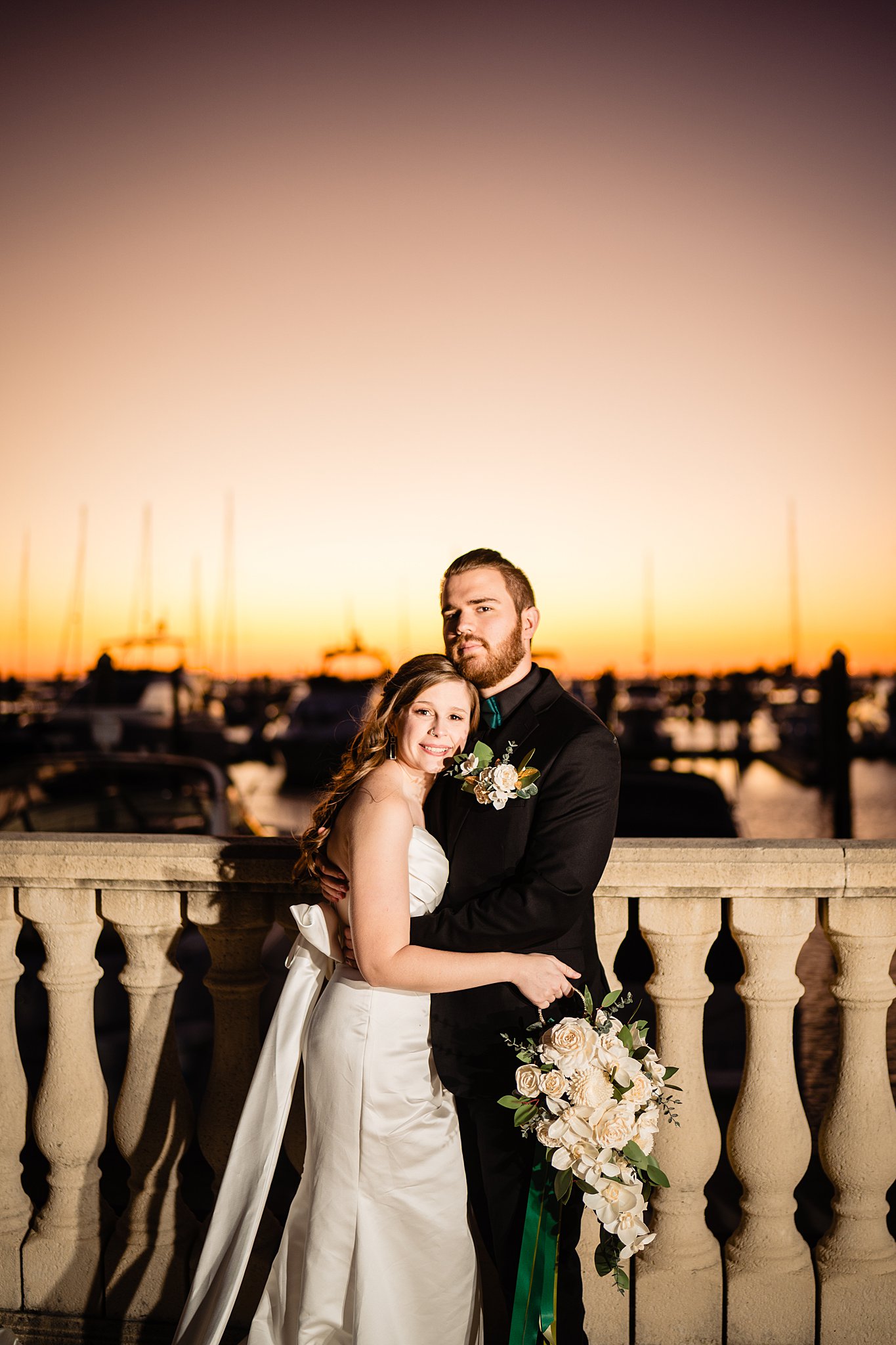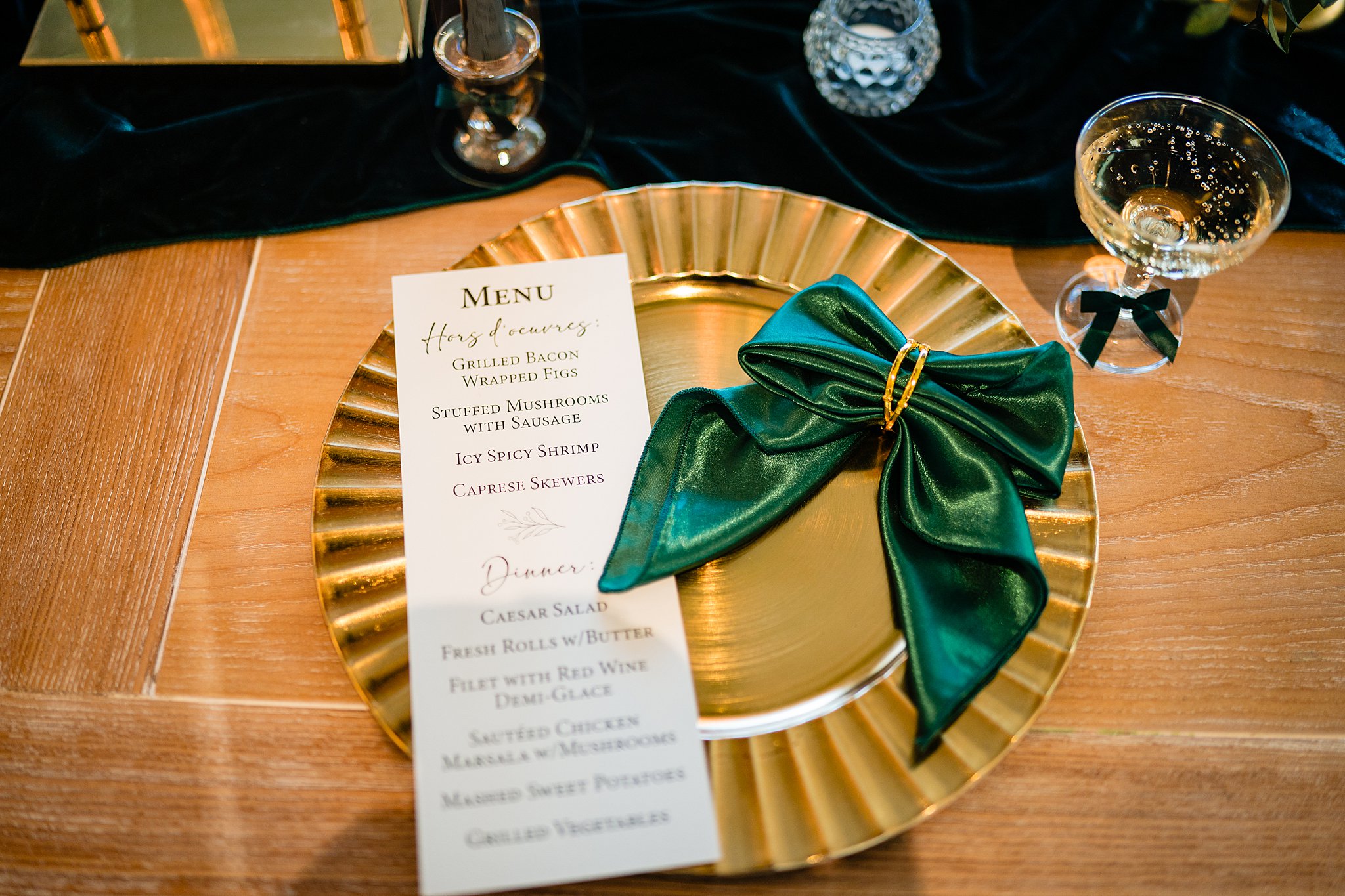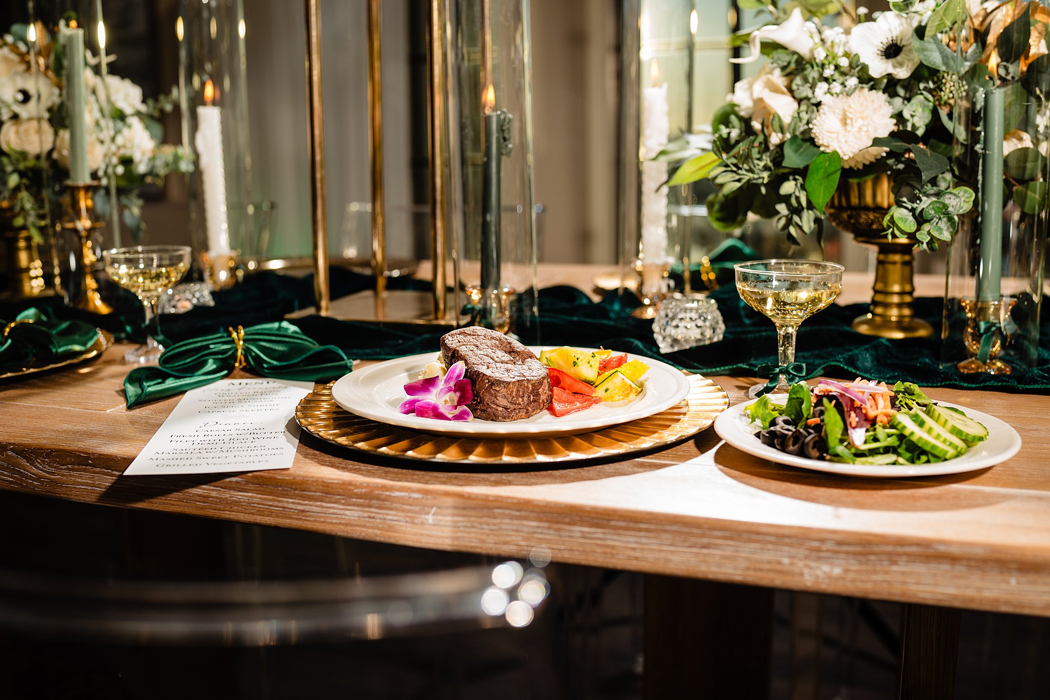 The collaboration between talented vendors brought the vision to life, blending classic and contemporary styles. From Shy Chic Boutique’s statement florals to the stunning gown by Bearer of the Bling Bridal and décor from Stella Rose Events, every detail shined. The mix of emerald, ivory, and ash wood created an unforgettable setting framed by the marina views and the relaxed comfort that made this shoot truly special.