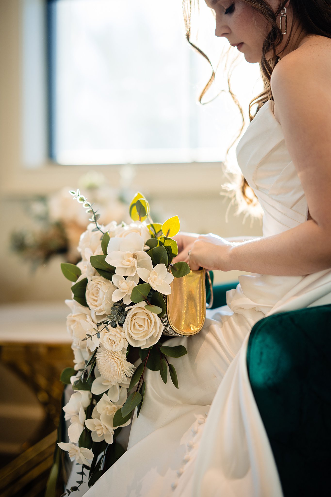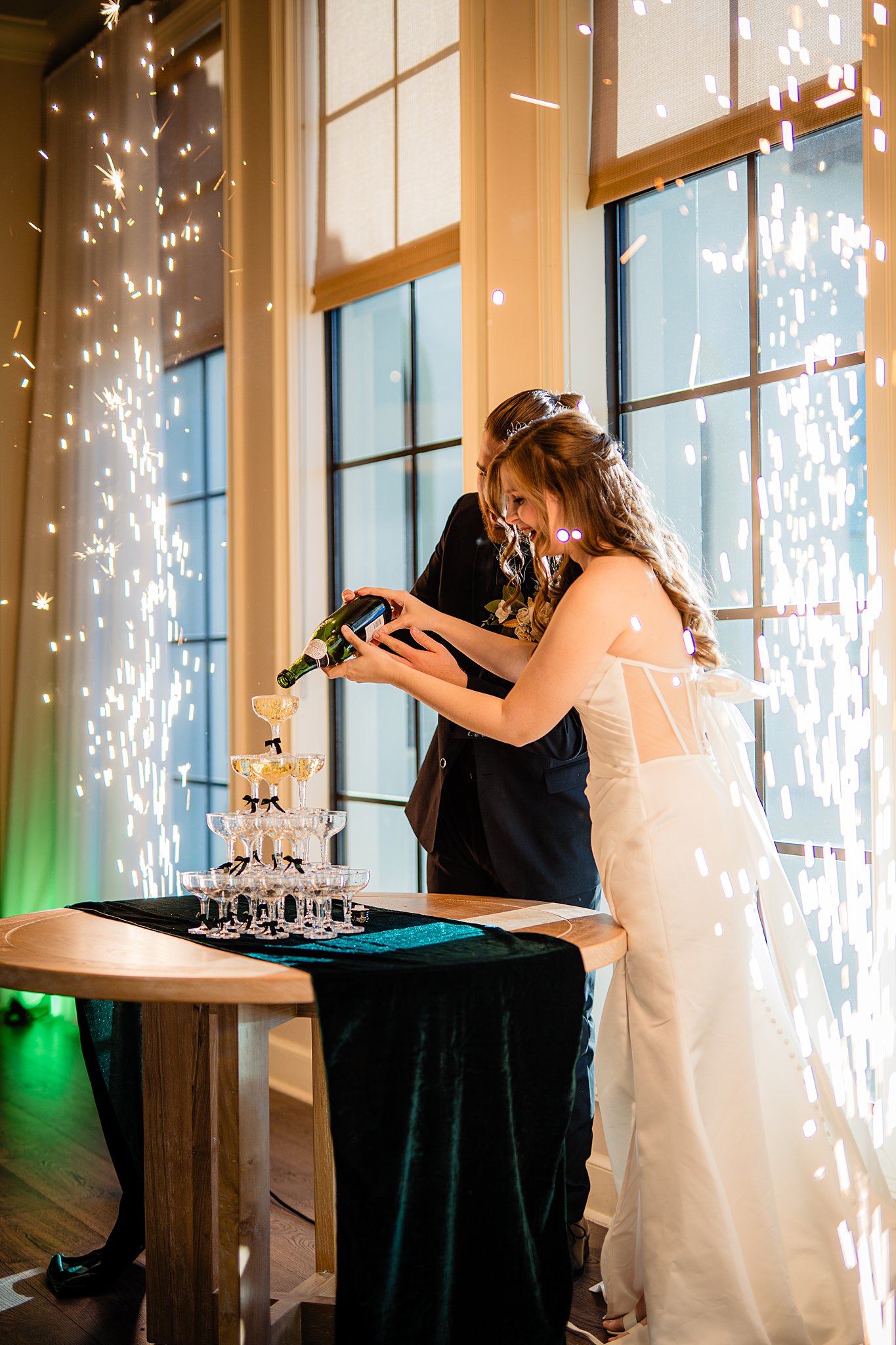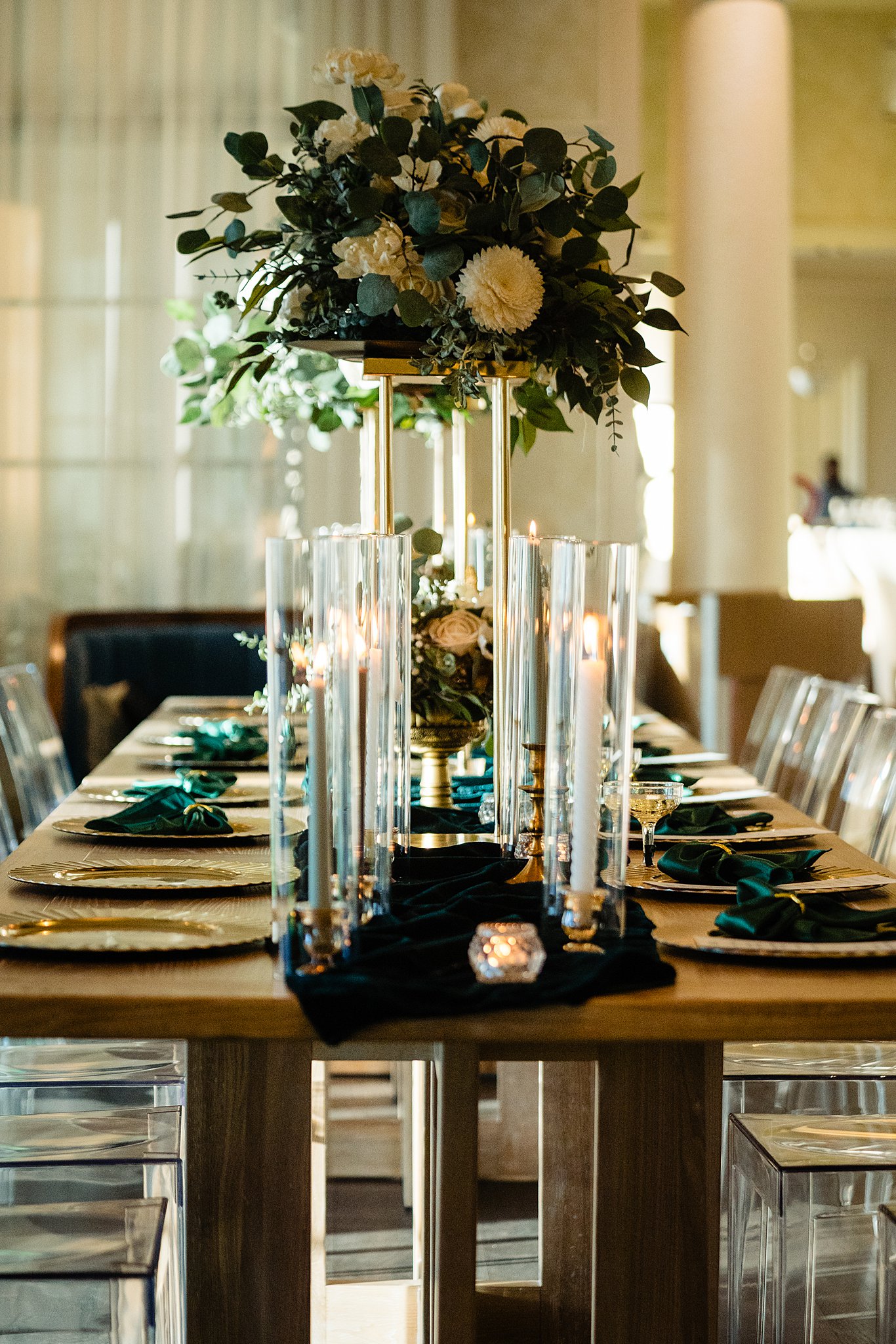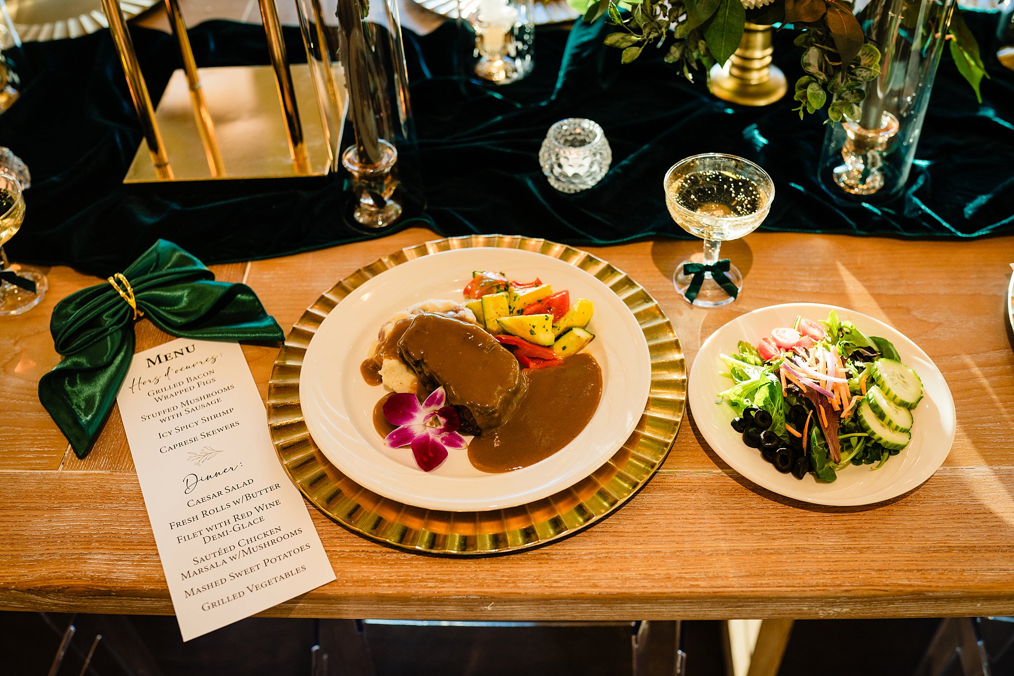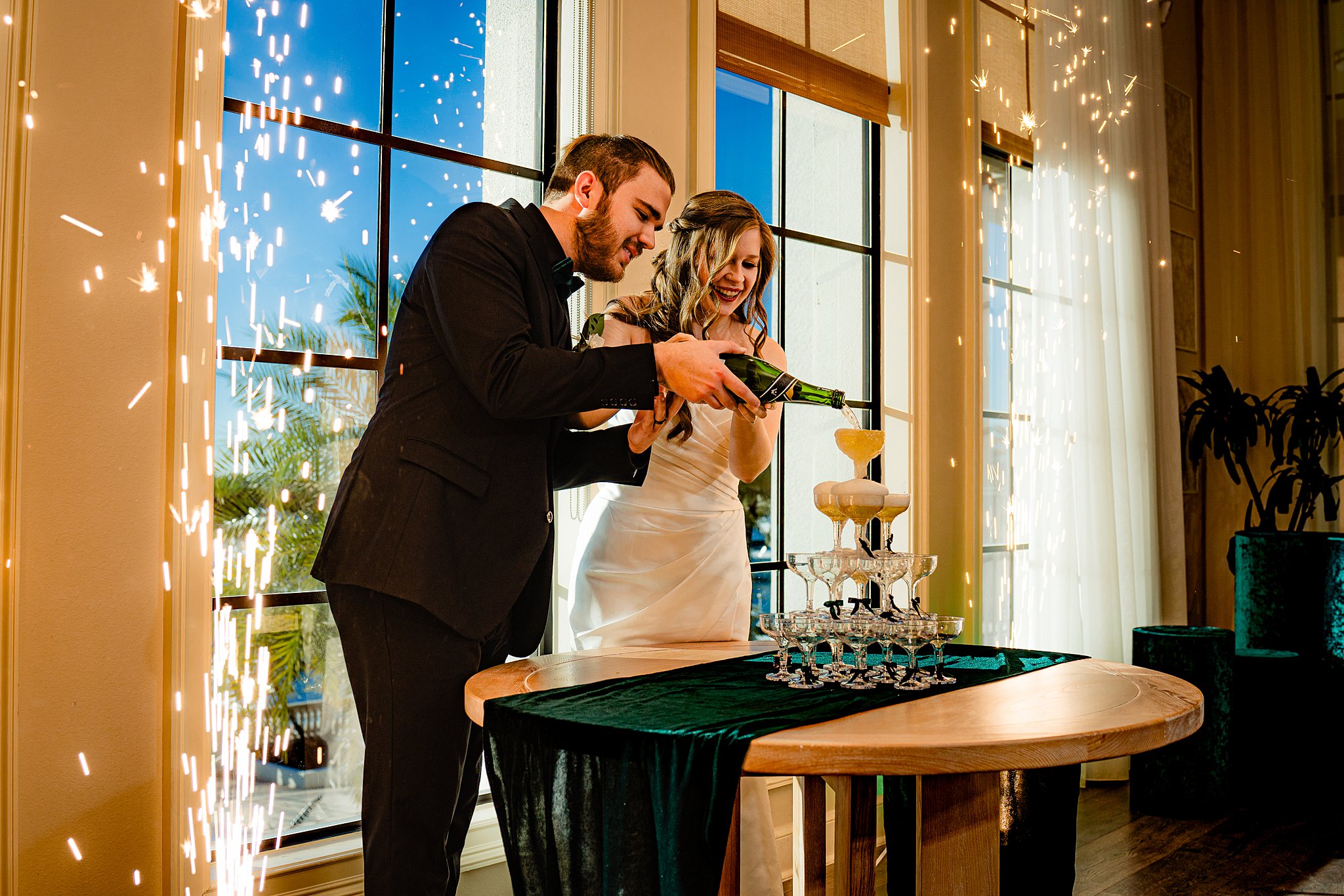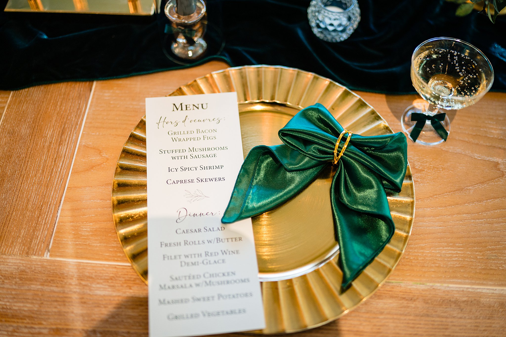 The collaboration between talented vendors brought the vision to life, blending classic and contemporary styles. From Shy Chic Boutique’s statement florals to the stunning gown by Bearer of the Bling Bridal and décor from Stella Rose Events, every detail shined. The mix of emerald, ivory, and ash wood created an unforgettable setting framed by the marina views and the relaxed comfort that made this shoot truly special.