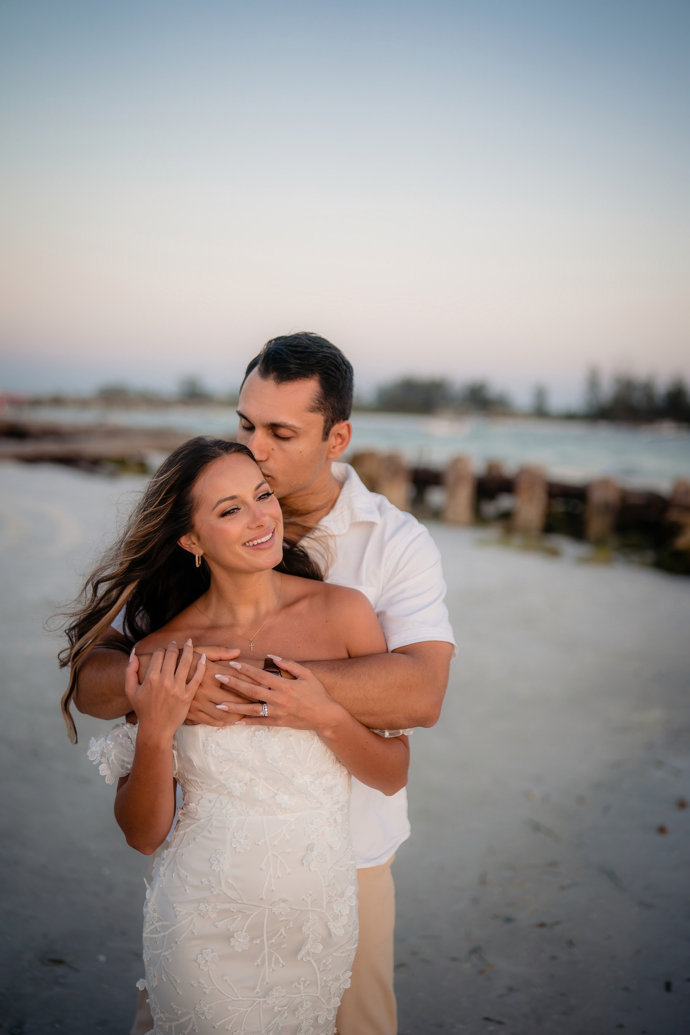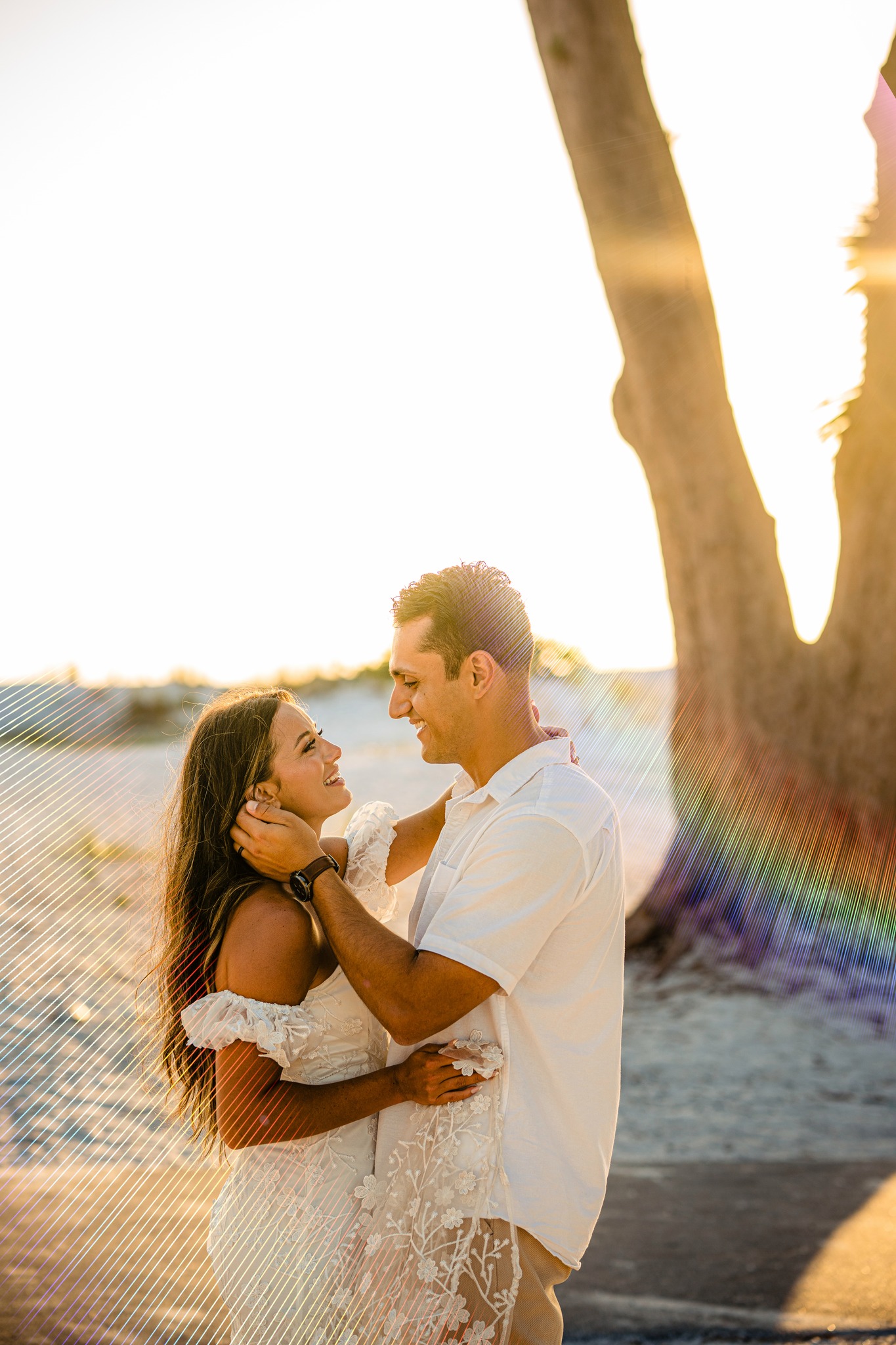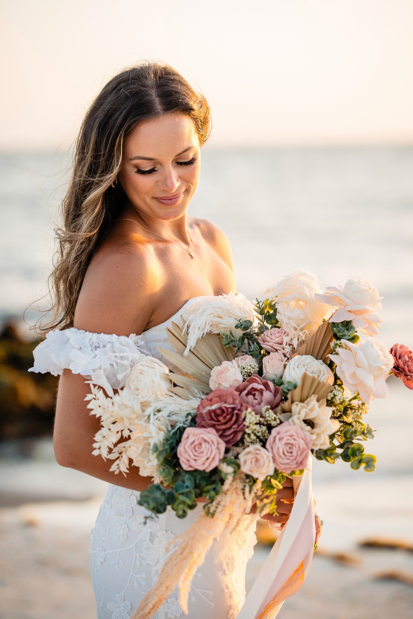 The couple for this shoot was Rich and Aleea, newlyweds who were married in New England where cloudy skies and rain limited their wedding day portraits. This styled shoot became the perfect excuse to create the sunset images they had always dreamed of and made it even more special knowing they are our neighbors. We are incredibly grateful to collaborate with such an amazing vendor team including Shy Chic Boutique, Barefoot Weddings, Ashley Palmer Photography, and Always Special Events. Being surrounded by passionate professionals and genuine connections made this styled shoot truly unforgettable.