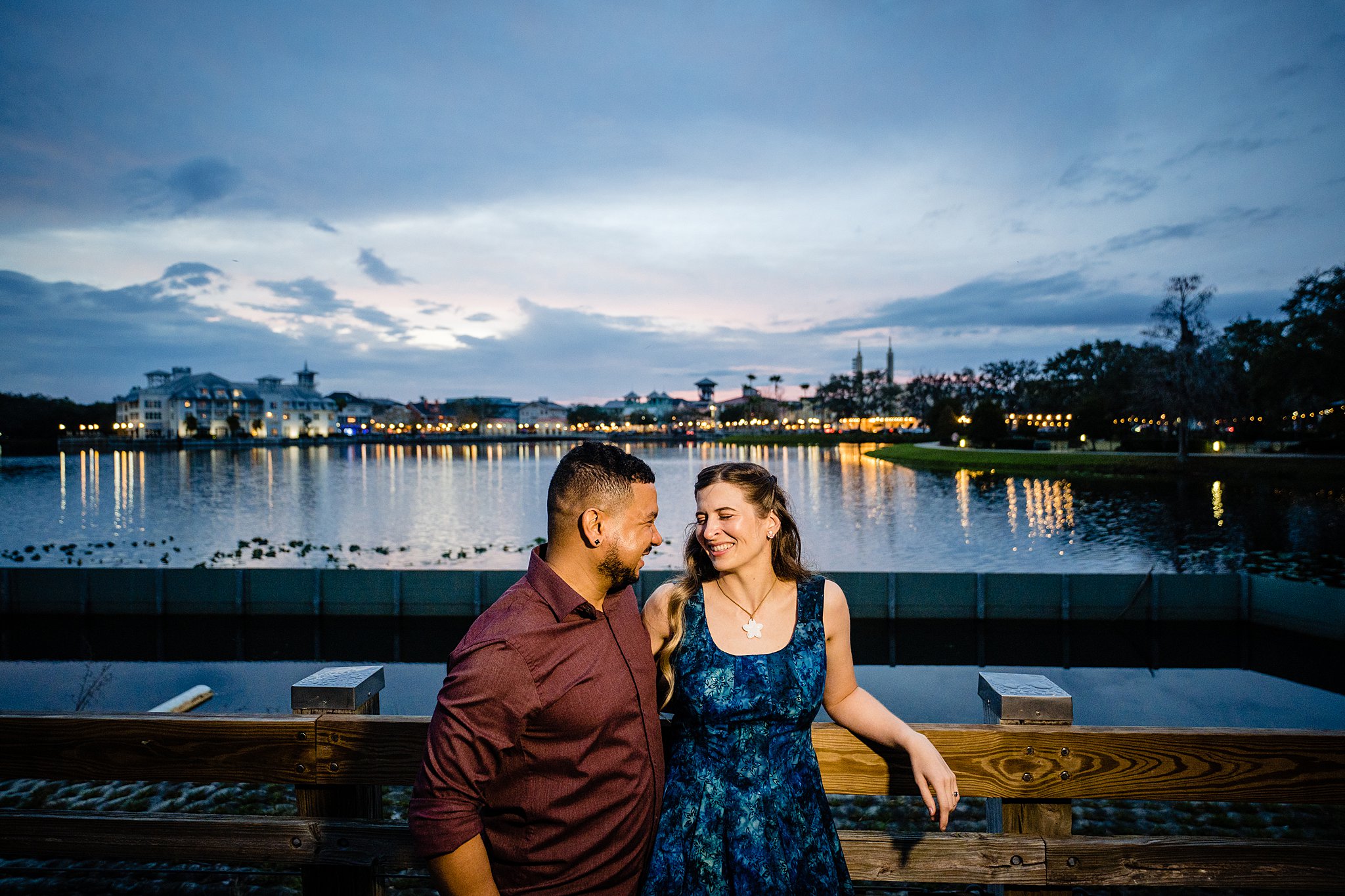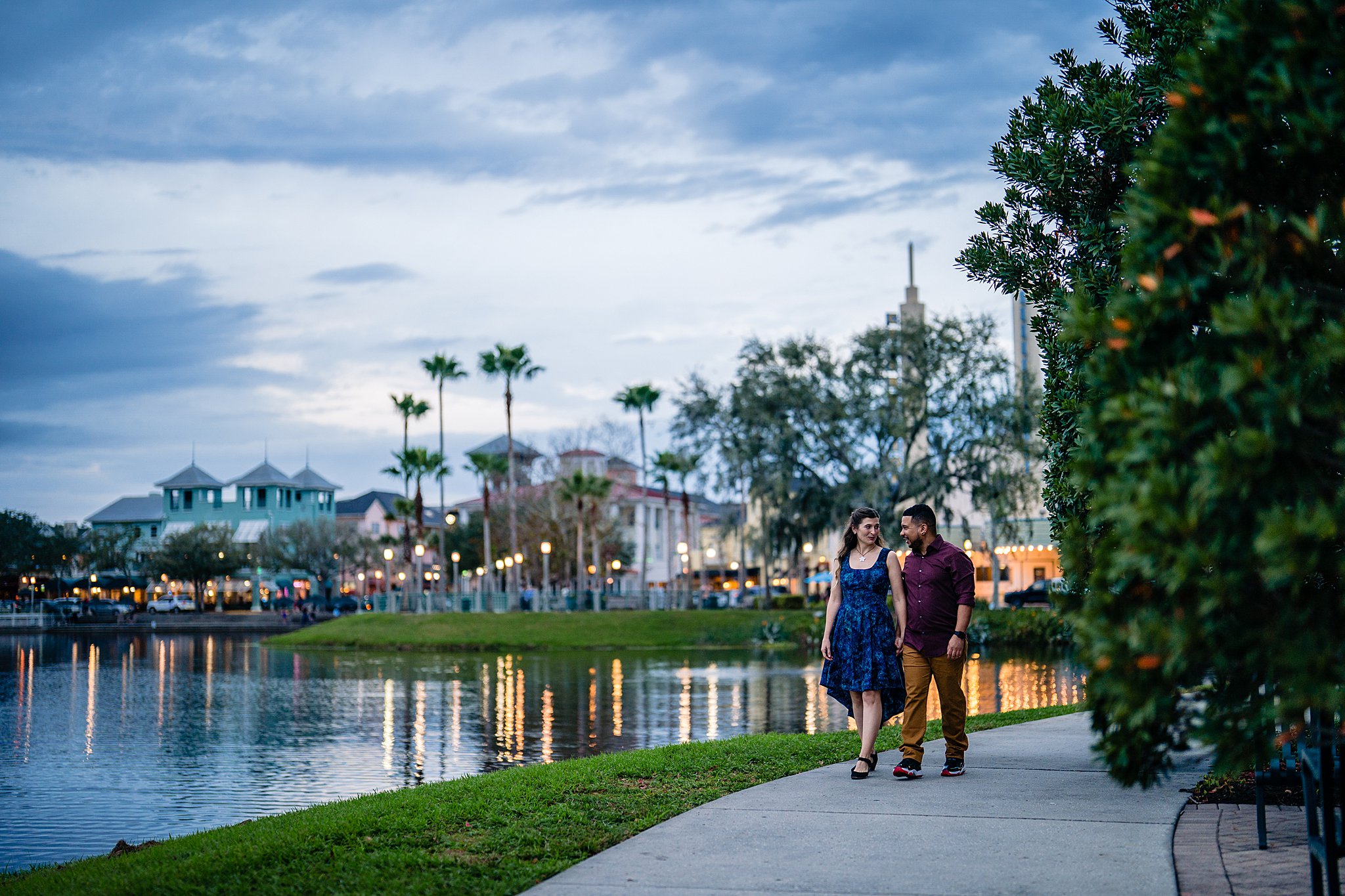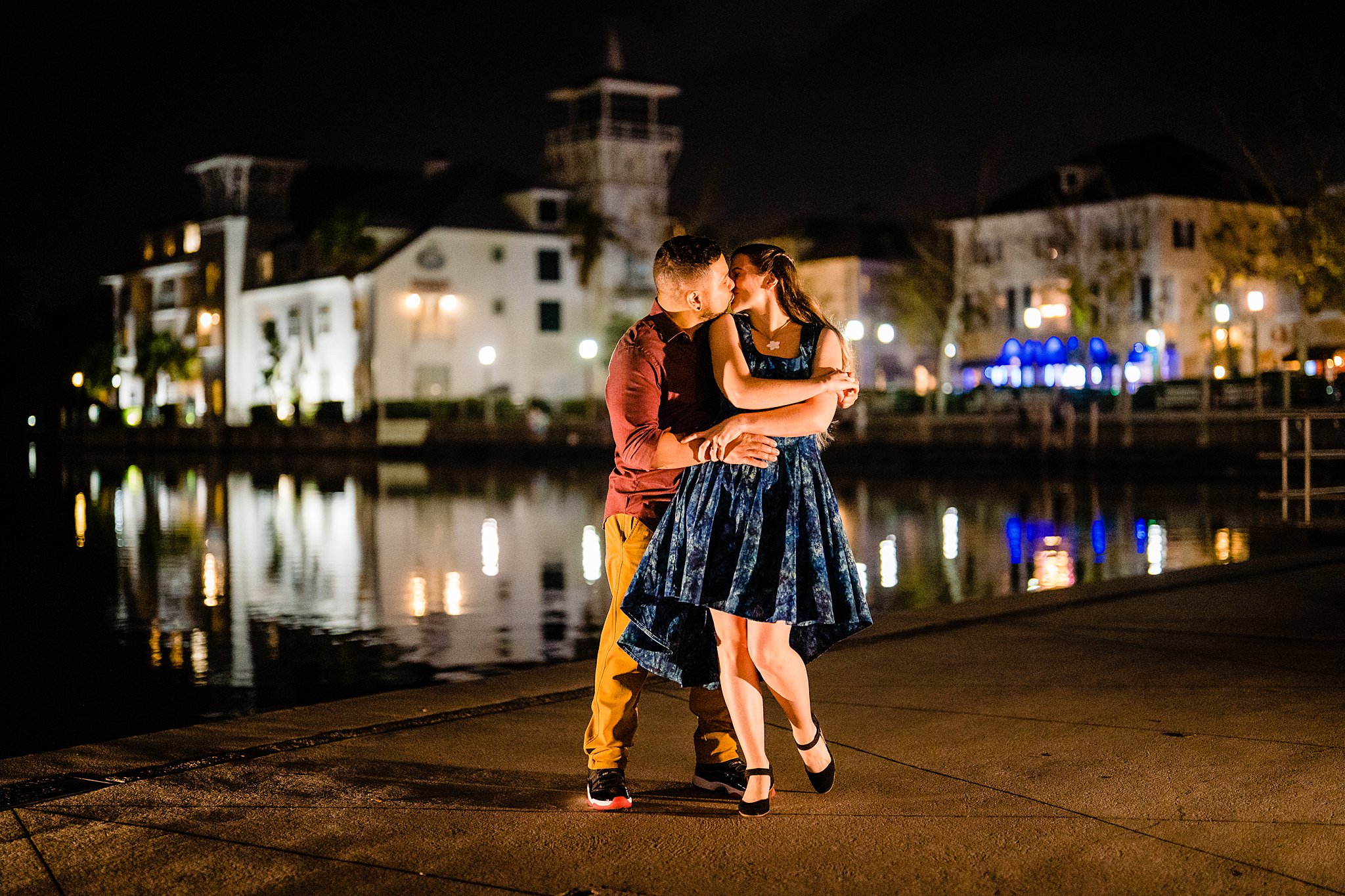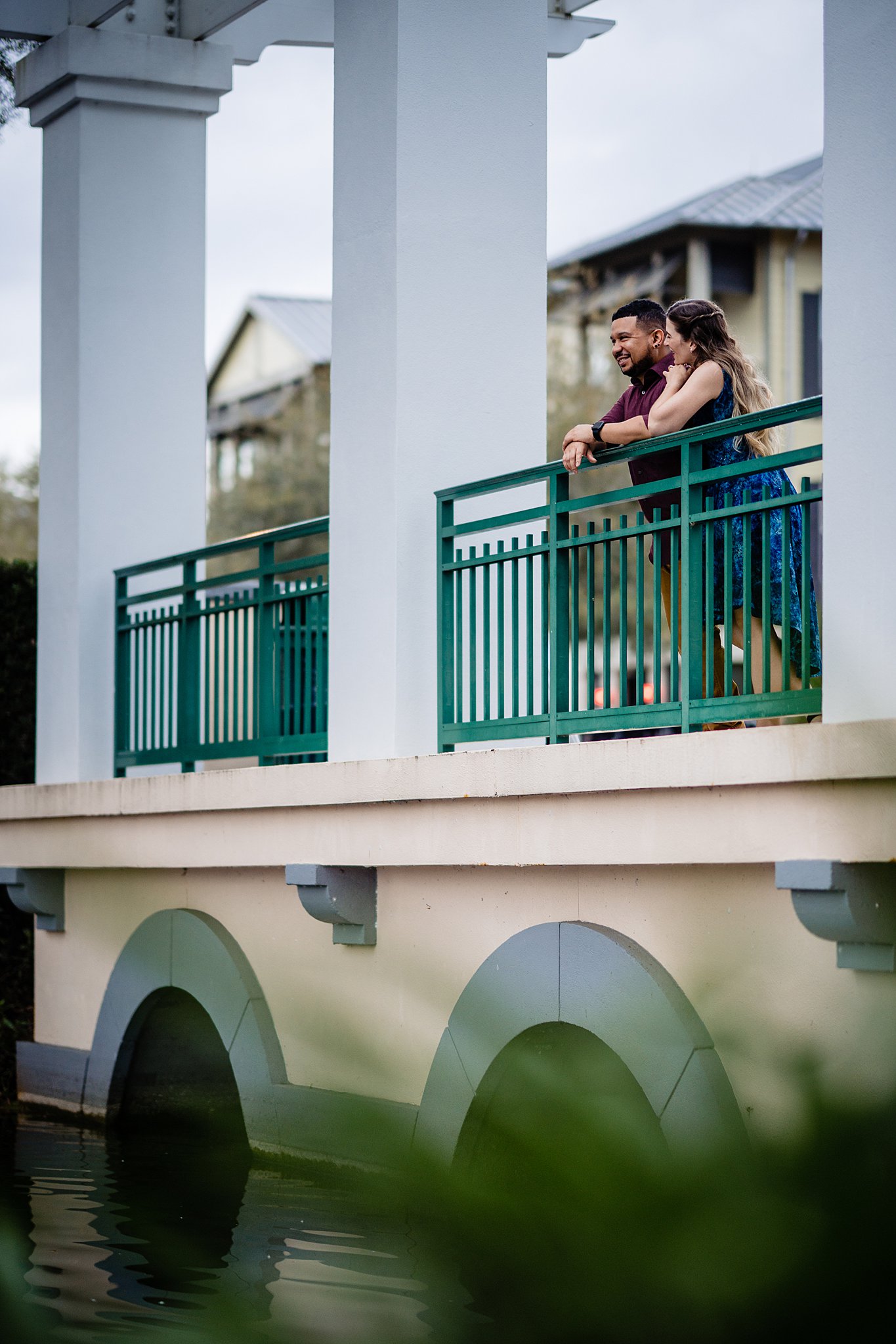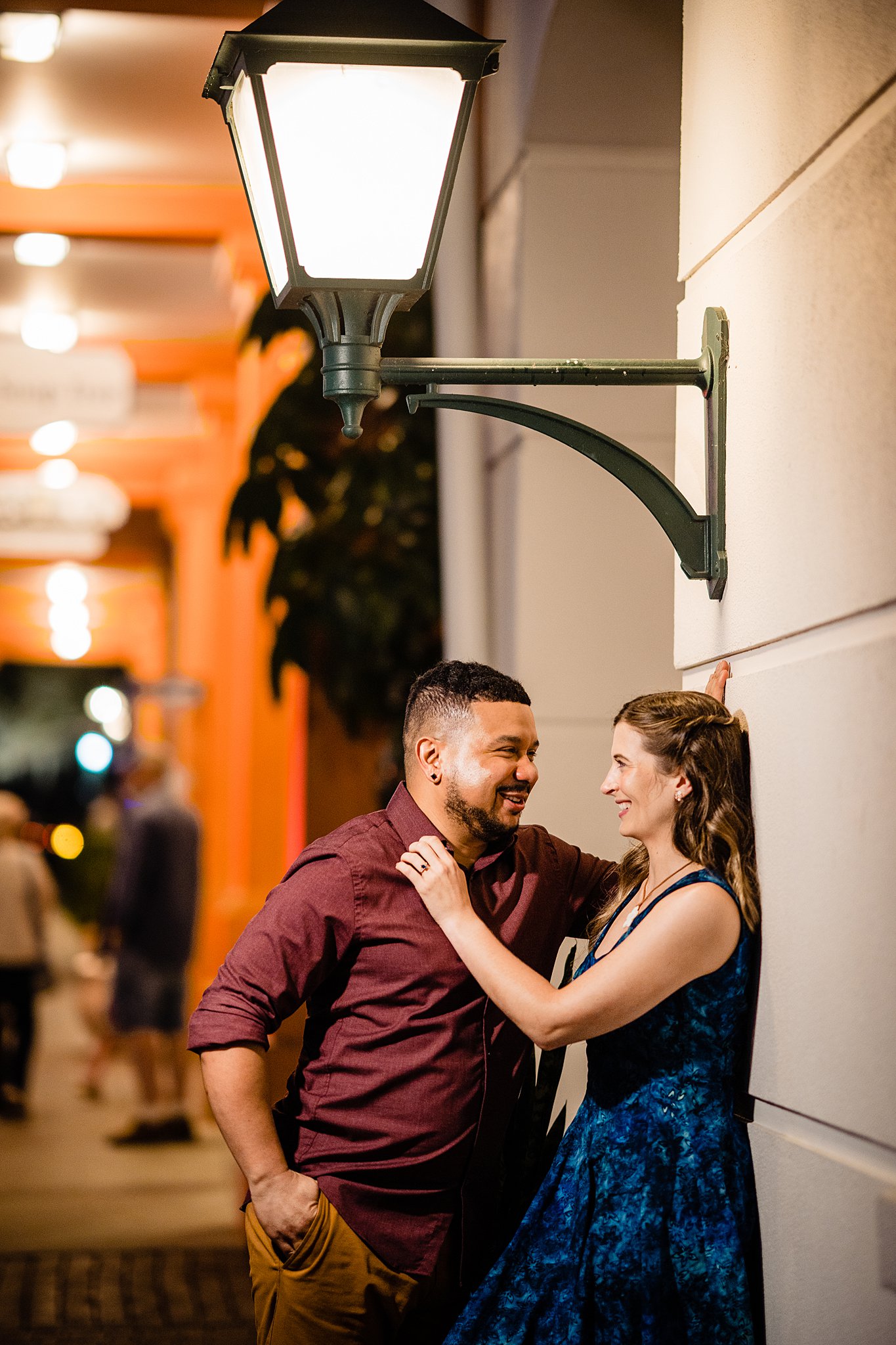Dax and Gil’s engagement session in Downtown Celebration started with a bit of rain, but that just made the evening even more magical. As the clouds cleared, the streets emptied, leaving us with a quiet and romantic city backdrop that felt like it belonged just to them. They first met at work, and from the moment we started photographing, their natural connection and laughter made it clear their story was something special.