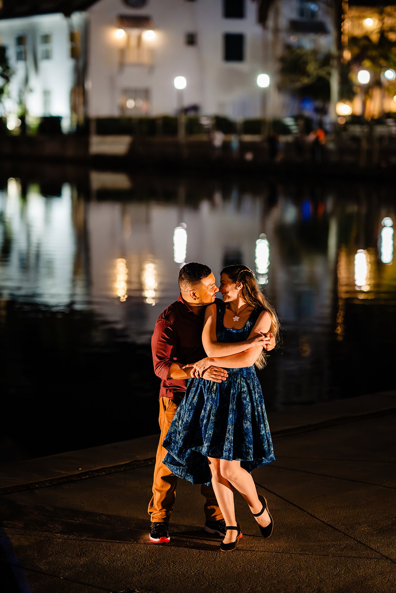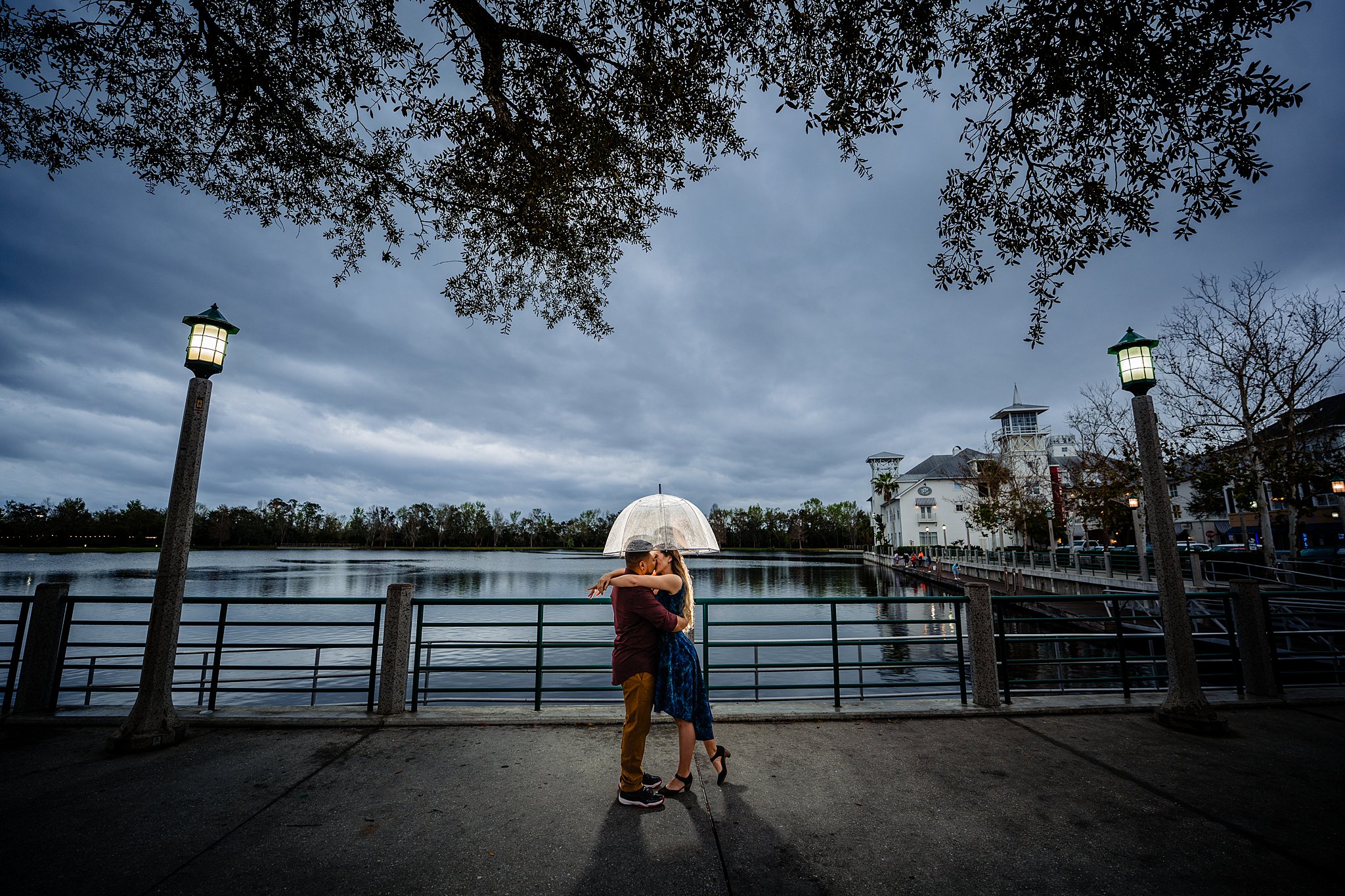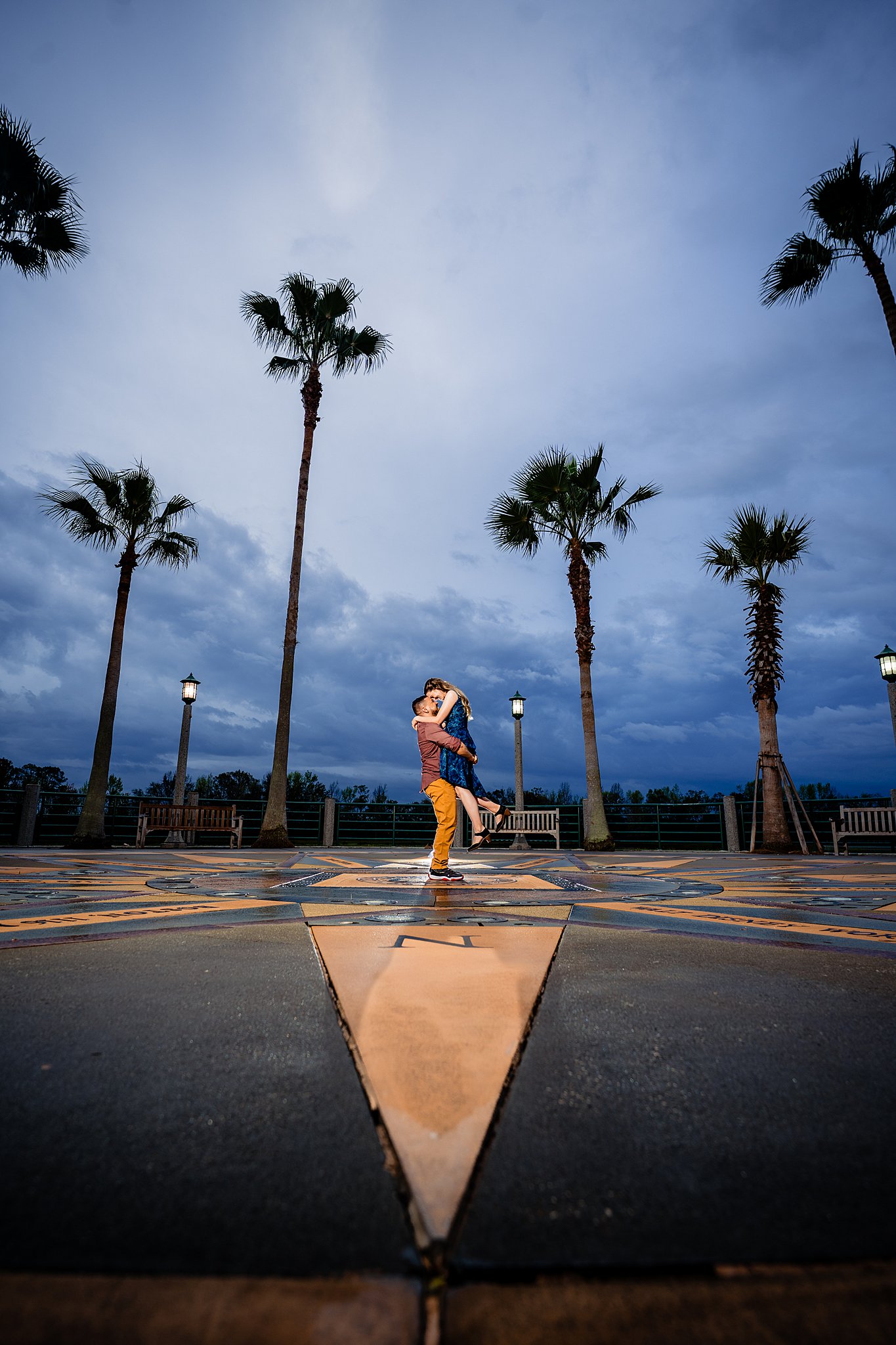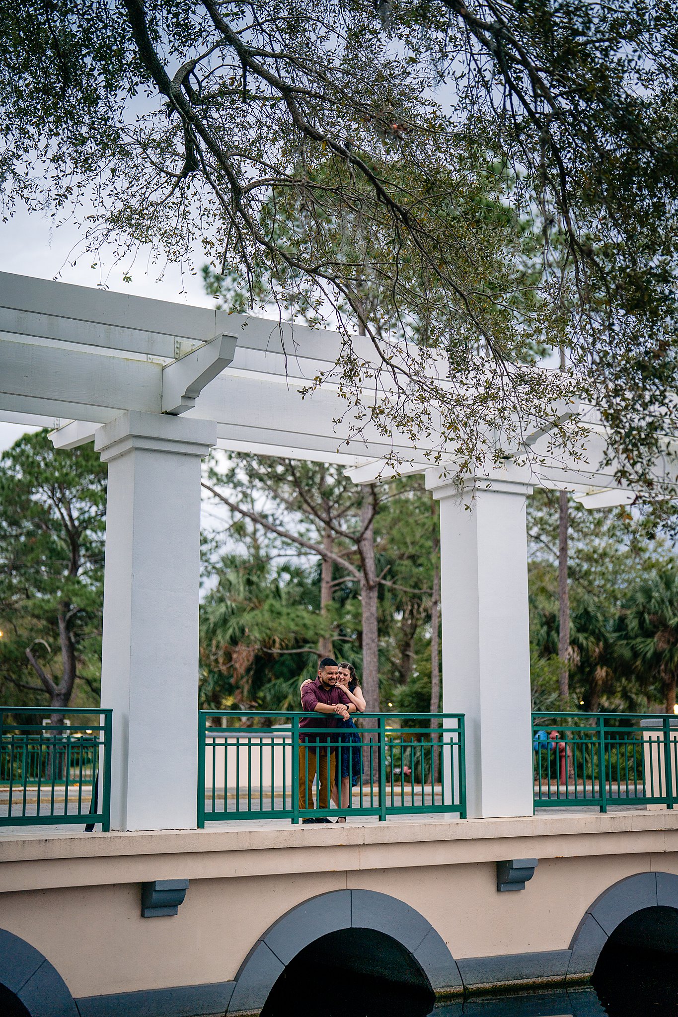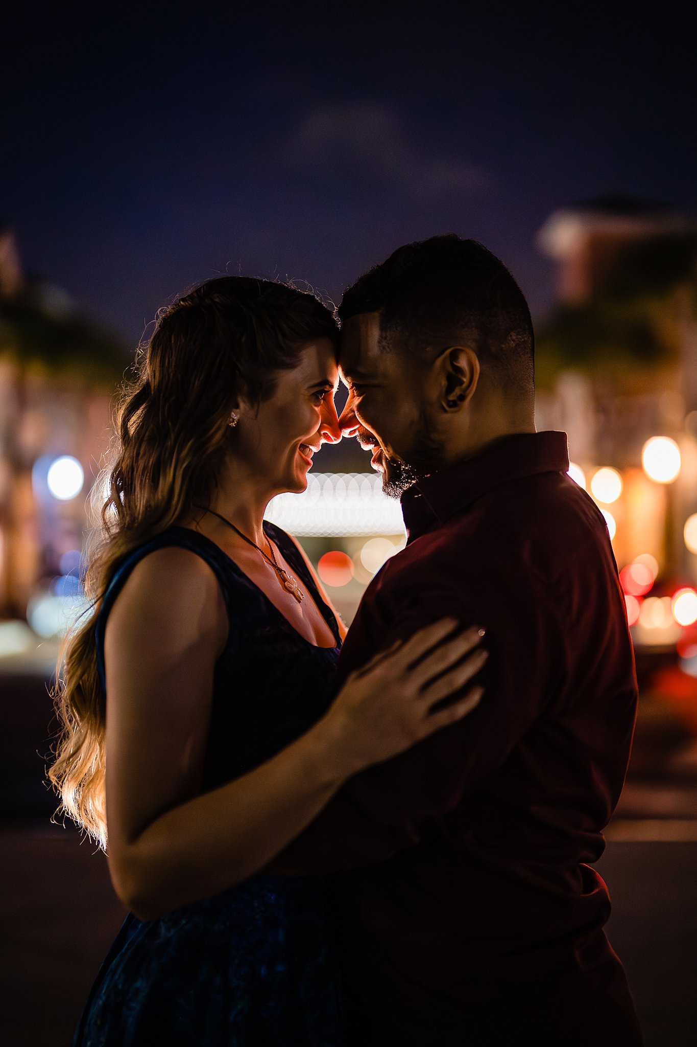 Dax and Gil’s engagement session in Downtown Celebration started with a bit of rain, but that just made the evening even more magical. As the clouds cleared, the streets emptied, leaving us with a quiet and romantic city backdrop that felt like it belonged just to them. They first met at work, and from the moment we started photographing, their natural connection and laughter made it clear their story was something special.