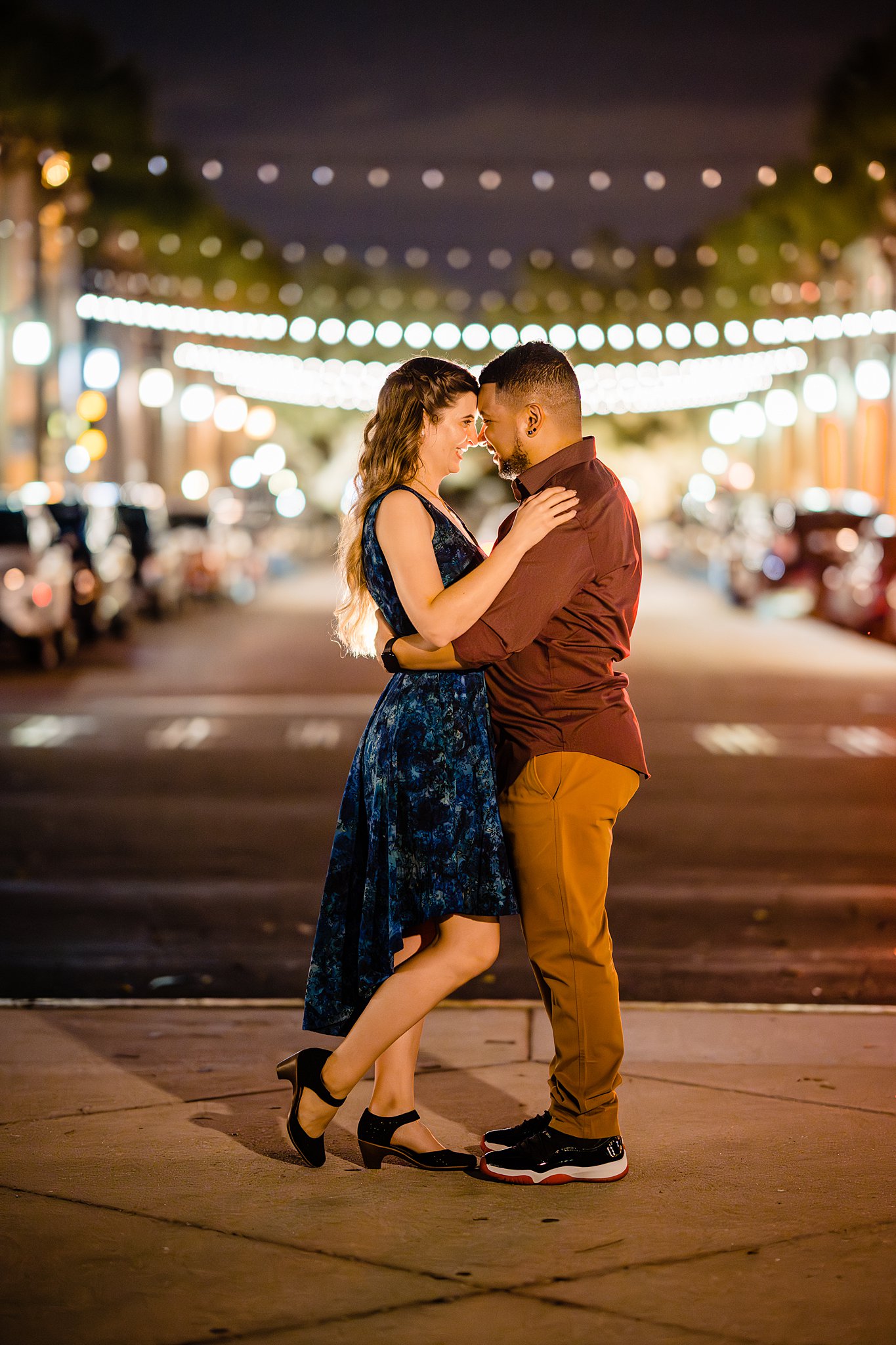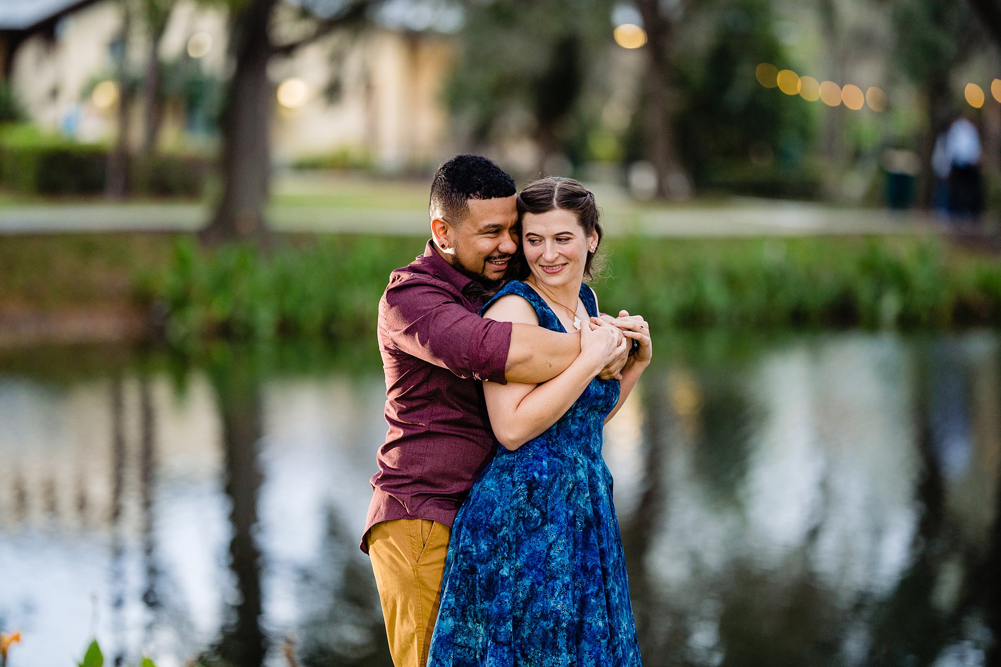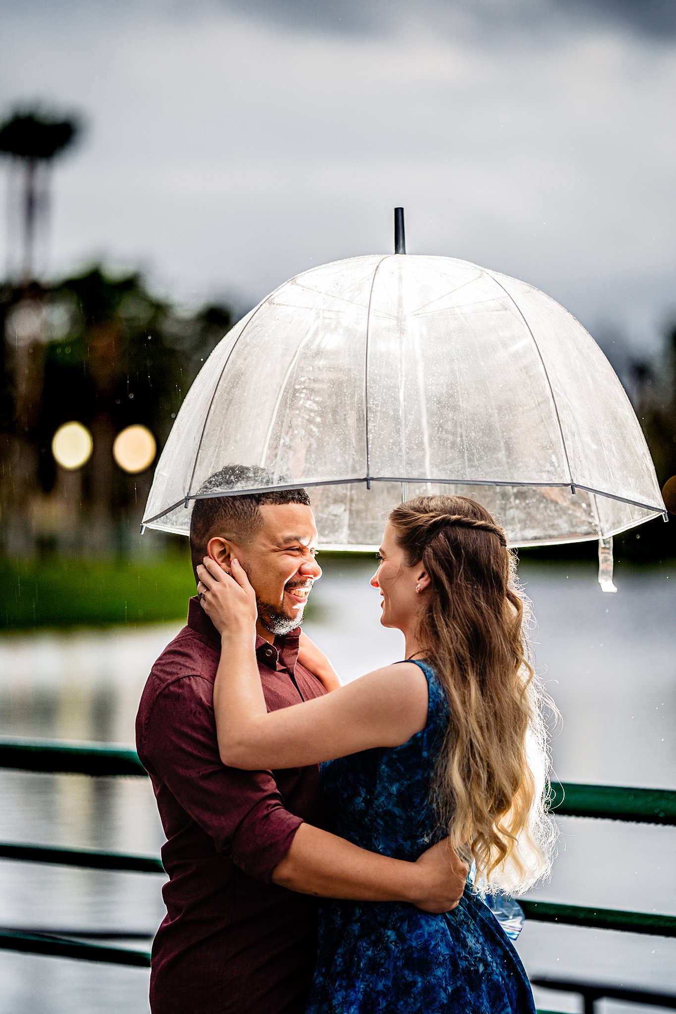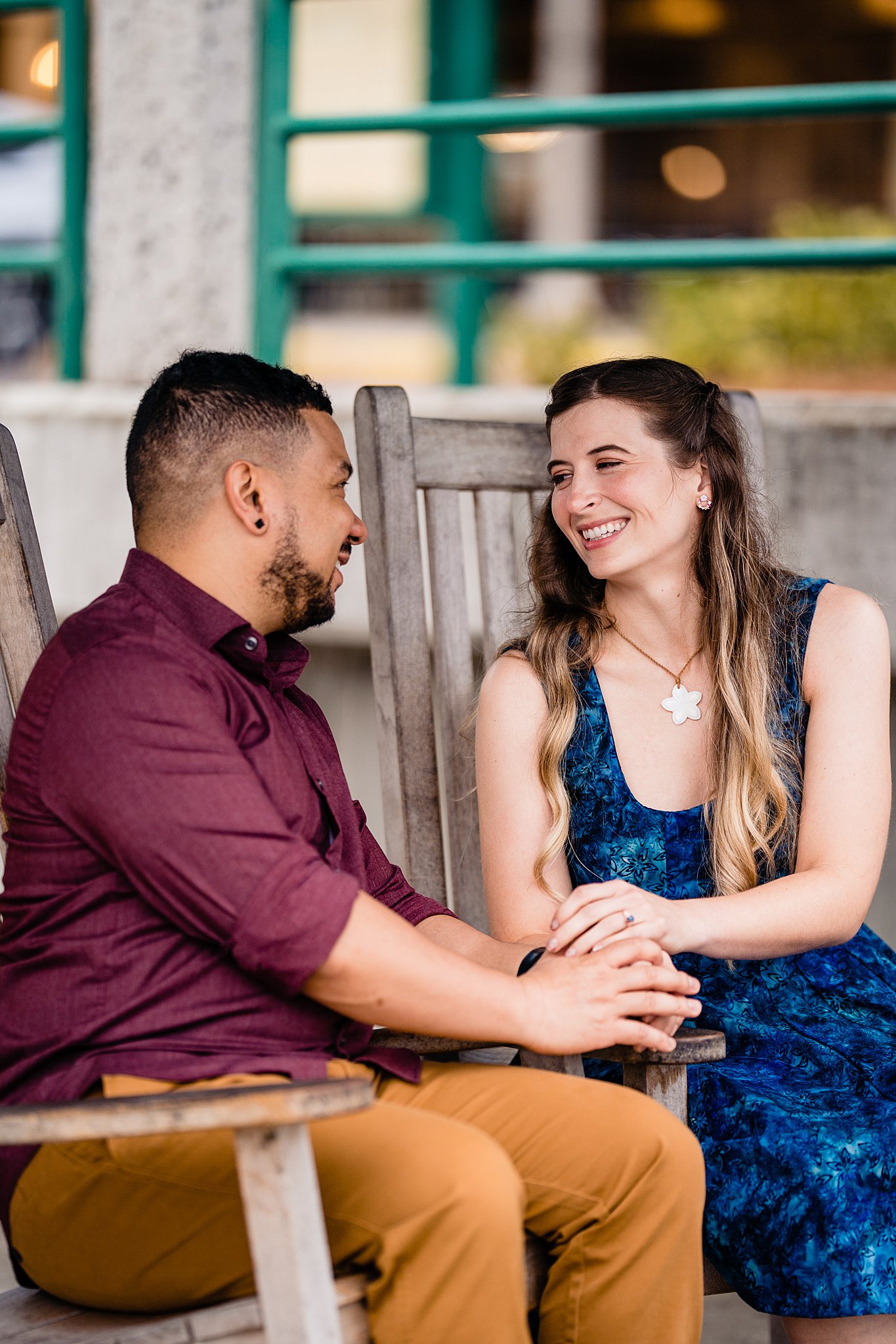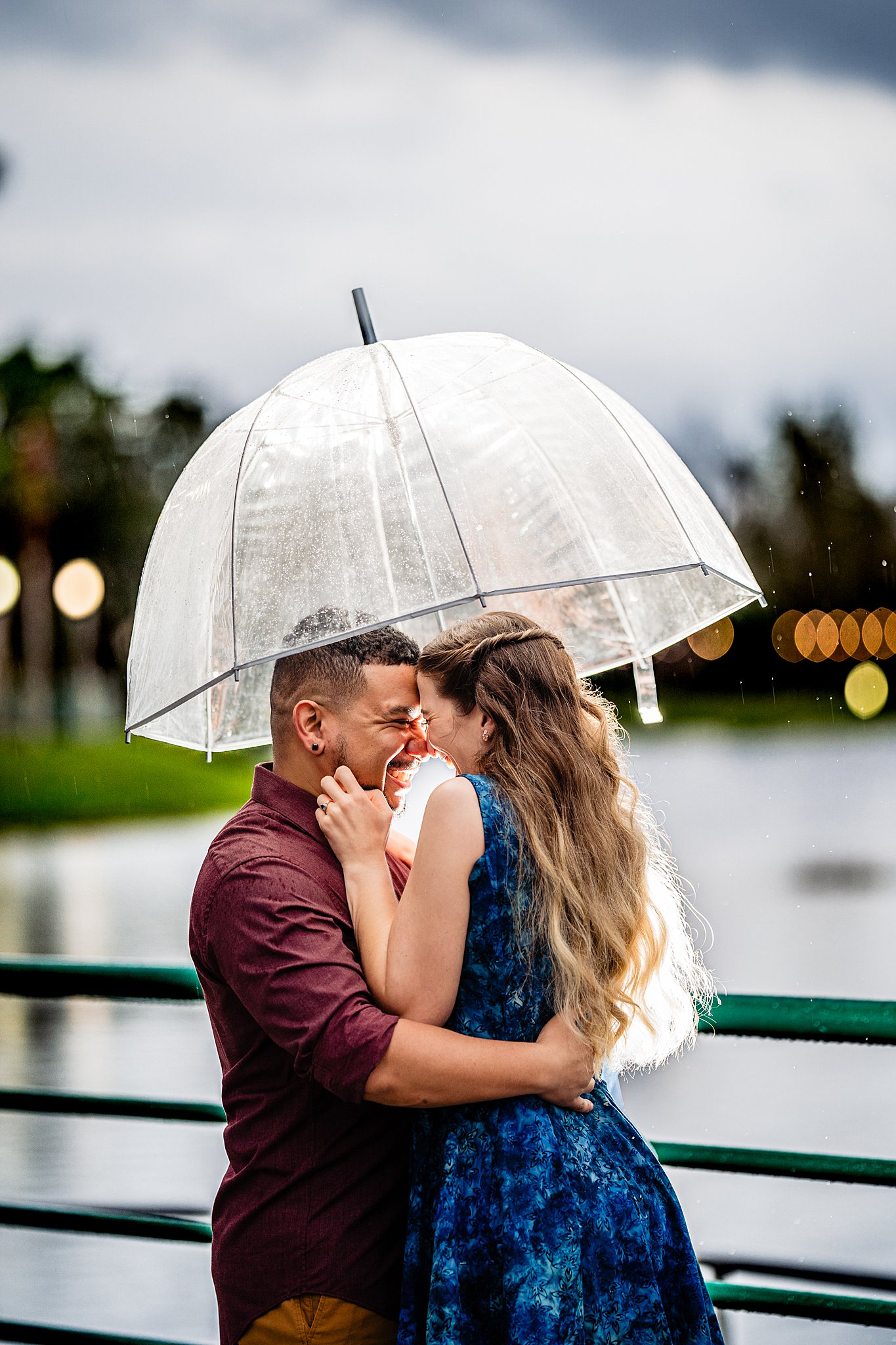 Dax and Gil’s engagement session in Downtown Celebration started with a bit of rain, but that just made the evening even more magical. As the clouds cleared, the streets emptied, leaving us with a quiet and romantic city backdrop that felt like it belonged just to them. They first met at work, and from the moment we started photographing, their natural connection and laughter made it clear their story was something special.